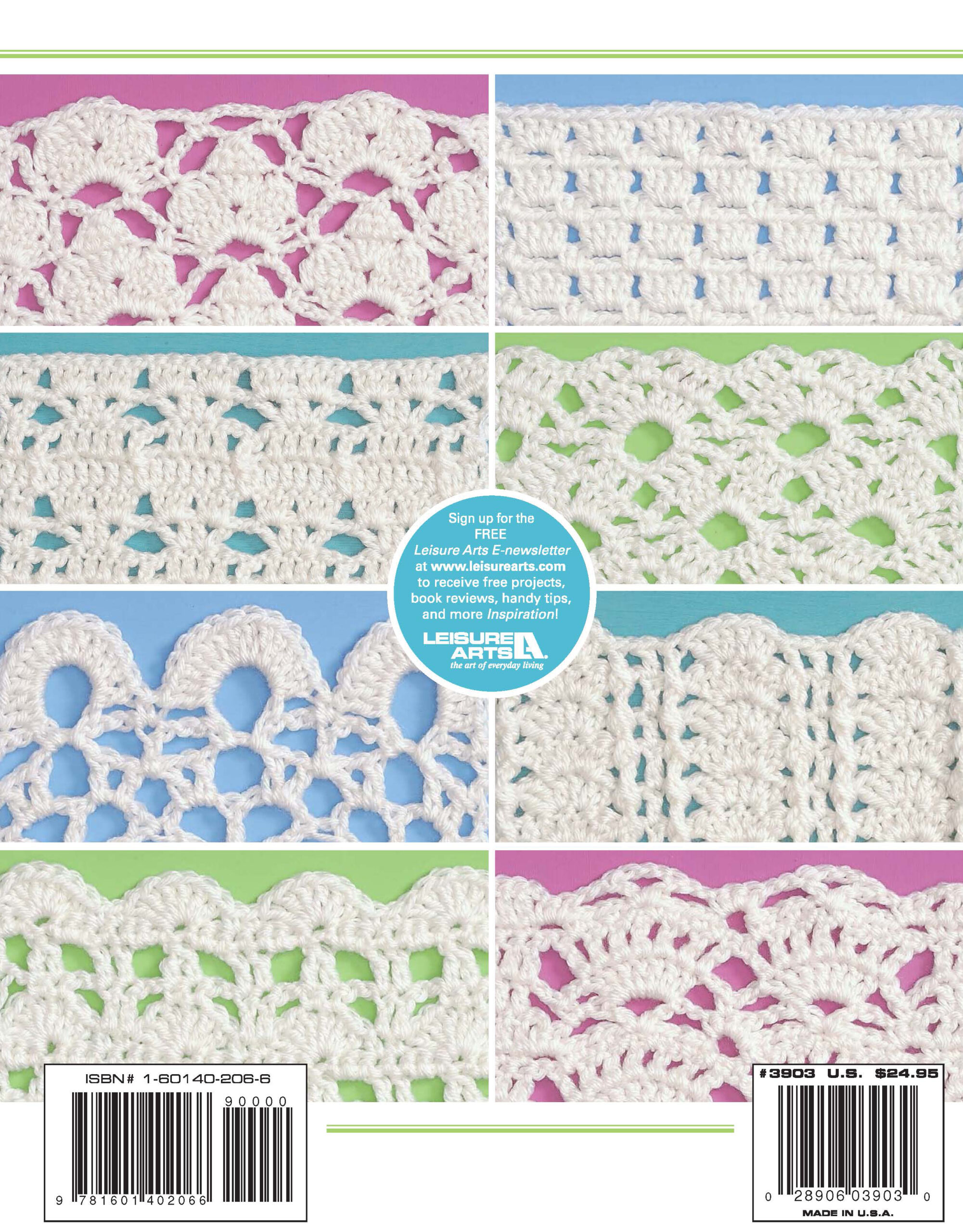 111 Easy Edgings Crochet- The easiest edgings you'll ever crochet, the 111 graceful designs in this collection let you skip all the arithmetic and planning of the traditional method. These beautiful edgings are worked from top to bottom. No matter what you use these to embellish, they will add a gorgeous finishing touch. Crochet designs include: shells, waves, scallops, and so much more. Same designs are crocheted with size 10 bedspread weight cotton thread and a steel US size 7 crochet hook. Includes row-by-row instructions for each design and a general guide to crochet. 60 pages, softcover.