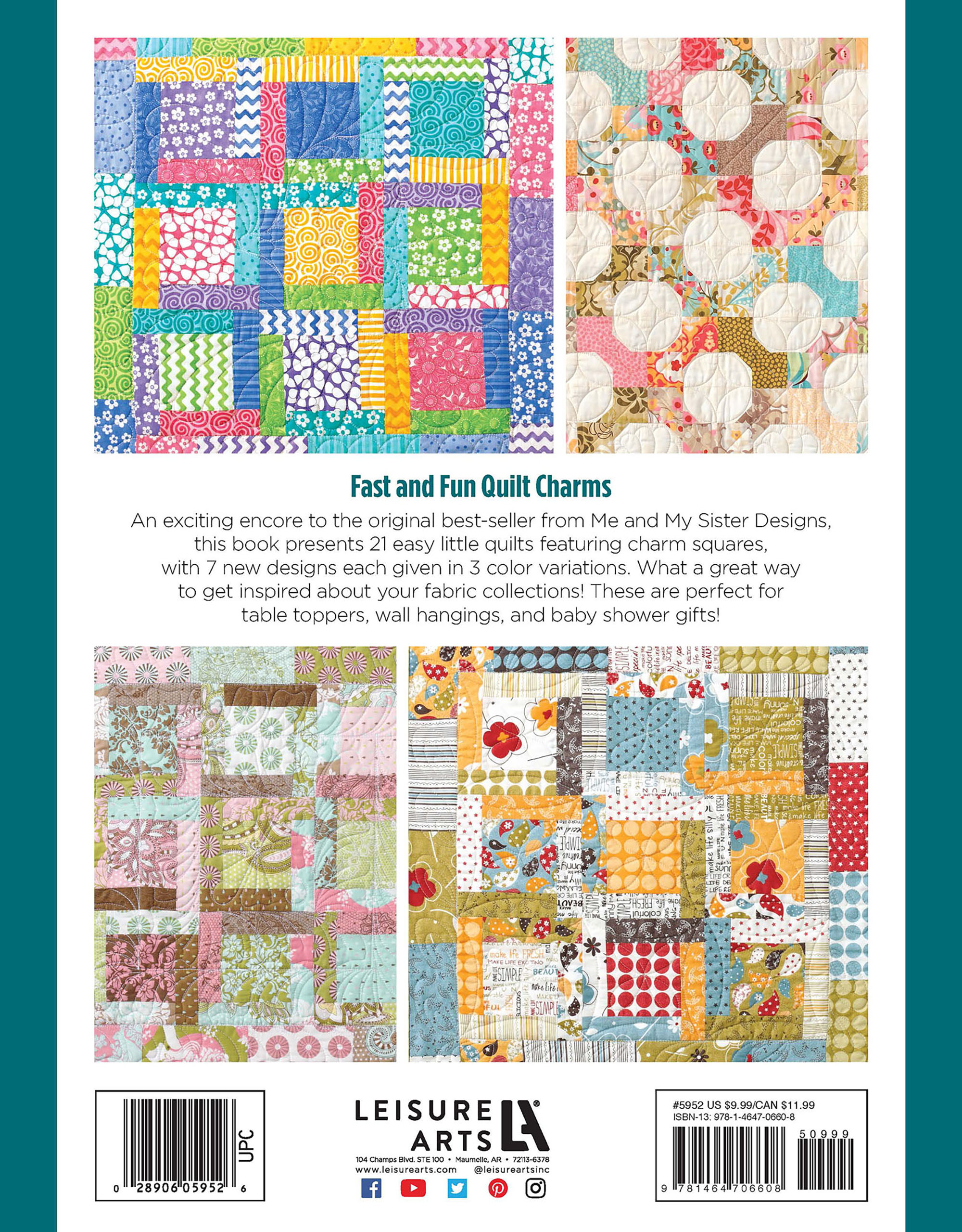 3 Times The Charm 2- An exciting encore to the original best-seller from Me and My Sister Designs; 21 quilt designs featuring pre-cut charm packs, 5" fabric squares, with 7 new designs each given in 3 color variations to inspire your creations. Perfect for table toppers, wall hangings, and baby shower gifts. The piecing is fast and simple. Step-by-step cutting and sewing instructions with full-color diagrams, plus photos of original fabric combinations, included. Designs: Hannah, Ingrid, Jennifer, Kendra, Leslie, Molly, and Nicole; pieced diagonal triangles, vertical and horizontal mixed striped blocks, alternating diamonds, pieced dogs and more with a variety of detailed borders. Finished quilt sizes measure between approximately 33"x 36" and 47"x 55". Beginner skill level. 40 pages, softcover.