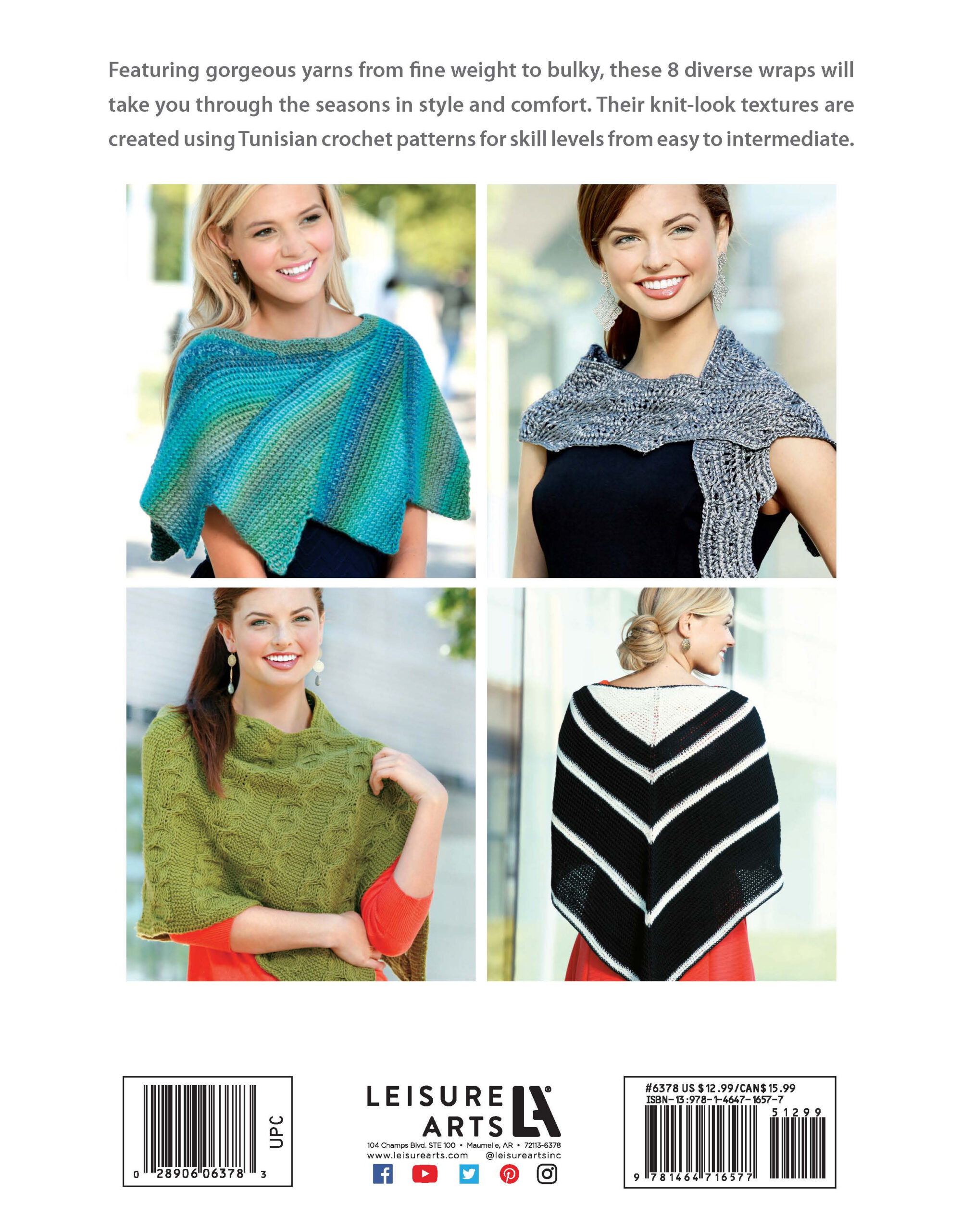 $12.99Tunisian Shawls Crochet- Discover a fabulous way to mix colors and textures. Featuring gorgeous yarns from fine weight to bulky, these 8 diverse wraps will take you through the seasons in style and comfort. Their knit look textures are created using Tunisian crochet patterns for skill levels from easy to intermediate. Designs include: expanding vees, cables and hearts, hot pink lace, silver shimmer, and more. Includes step-by-step instructions and full-color photographed diagrams. Projects call for Tunisian hooks in US sizes K-10 1/2 and N/P that are at least 22" long. Finished shawls measure between approximately 12"x 24 1/2" and 60"x 20". Easy to intermediate skill level. 48 pages, softcover.