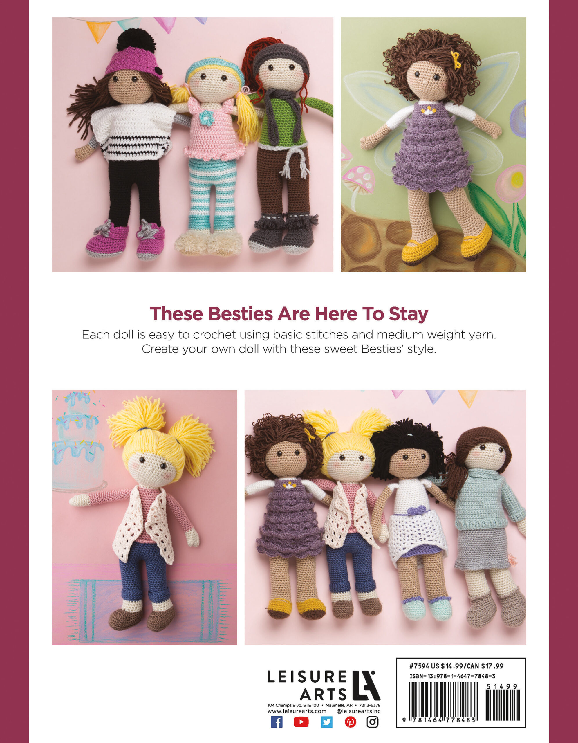 $12.99Crochet Besties Every Girl Needs A Friend- Features 7 easy-to-follow crochet doll patterns plus a design your own mix and match section so you can create your own unique doll. Each doll has its own personality and style: Fashionista Faye, Casual Kaye, Night-Night Nancy, Wistful Wanda, Lovely Debbie-Lyn, Dainty Dana, and Modest Mary-Ann. Step-by-step instructions with pictures and supply lists included. 64 pages, softcover.