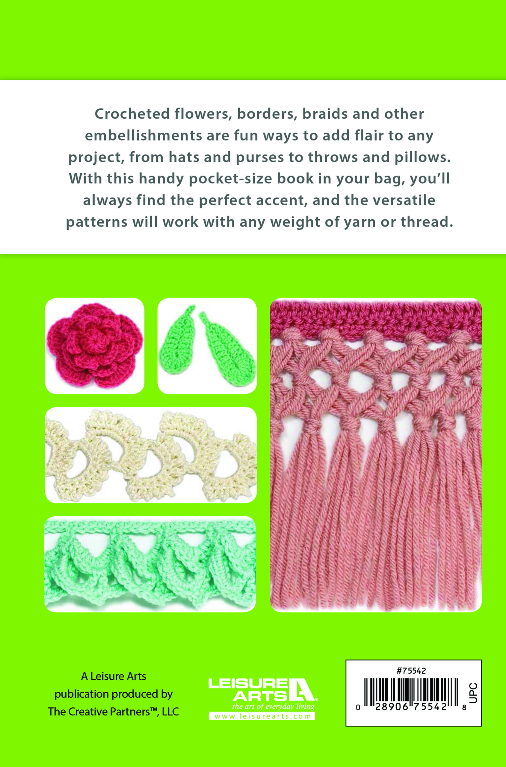 $9.99Embellishment Stitch Guide- Crocheted flowers, borders, braids, and other embellishments are fun ways to add flair to any project. Embellish hats, purses, throws, pillows and more. This portable reference guide will help you find the perfect accent for any project. Patterns work with any weight of yarn or thread. 96 pages in a softcover.