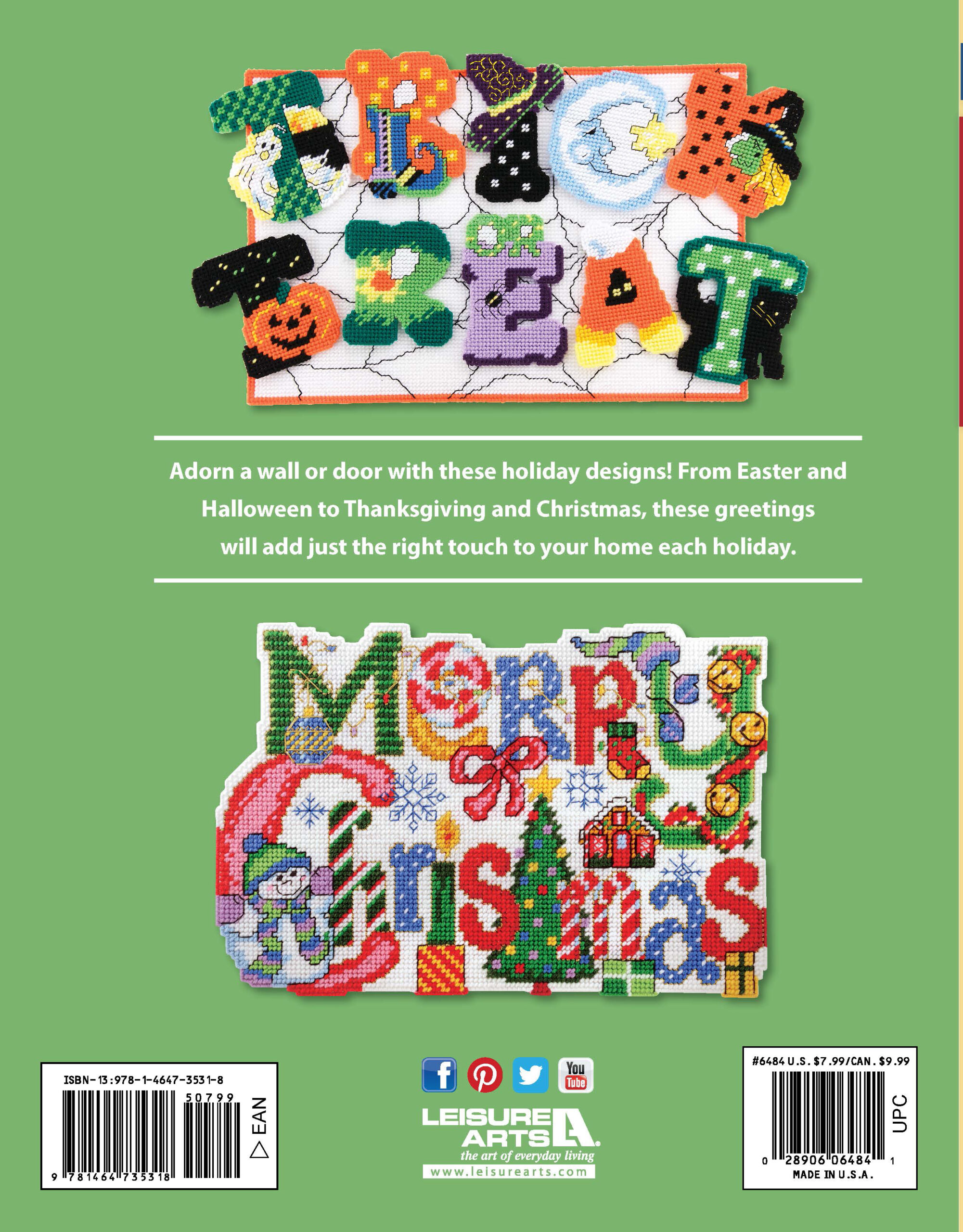$7.99Holiday Greetings Plastic Canvas- Decorate your home for the holidays with these plastic canvas designs for the door, wall, or table. From Easter and Halloween to Thanksgiving and Christmas, these designs will add just the right touch to your home throughout the year. Projects include bunny, chick, flowers, and eggs; spooky Halloween images on a spider web background; woodland critters and autumn images; and festive holiday and winter images. The designs are all worked on 7-mesh plastic canvas using worsted weight yarn. Includes a general guide to plastic canvas and charts for each design. 24 pages, softcover.