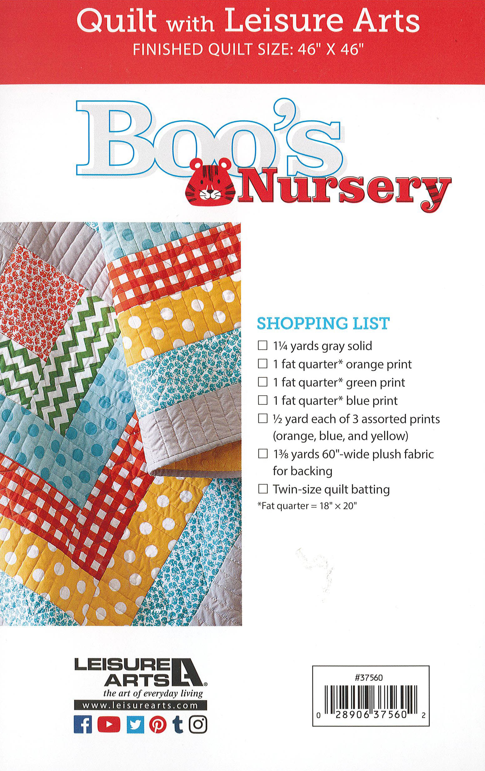 $7.99Leisure Arts Boo's Nursery Quilt Pattern- Brighten up the nursery with this delightfully cheerful quilt. Strips of patterned fabric dance over a solid base to give you the perfect blanket to wrap your baby in. This offset log cabin block can be made in bold and bright, soft pastels, or any color you desire. Includes instructions, diagrams, and tips. Finished quilt measures approximately 46"x 46". 16 pages in a soft cover.