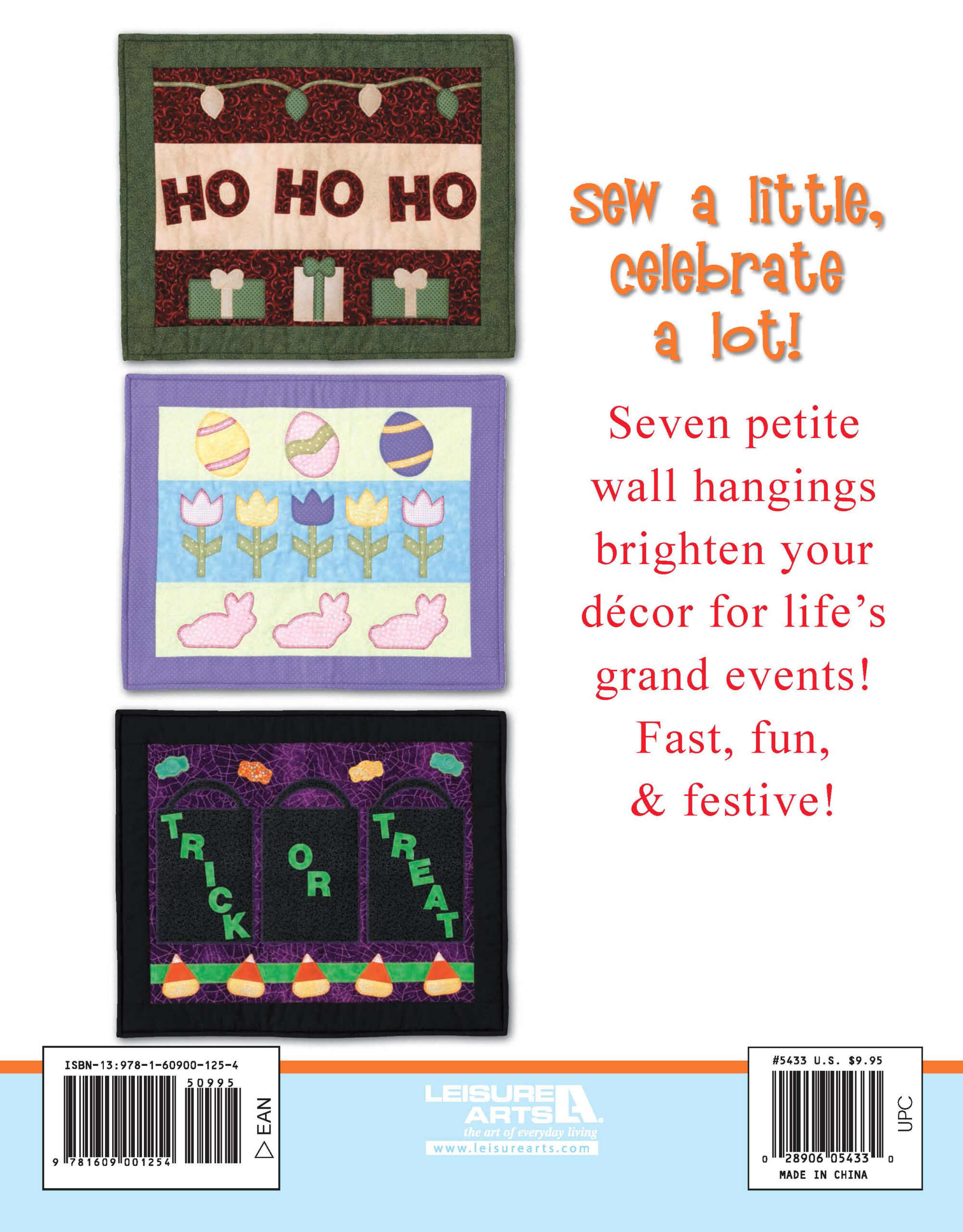Little Quilts For Big Occasions- Sew a little and celebrate a lot. These 7 petite wall hangings will brighten your decor for life's grand events. Get started on any one of these fun little quilts for special occasions, and you'll complete it in just a few quick sessions of applique, machine embroidery, and quilting. When time is of the essence, these lighthearted designs finish fast. Designs include: Christmas gifts, birthday cupcakes, July Fourth firecrackers, and more. Includes step-by-step instructions, templates and embroidery diagrams for each design. Some designs are fat-quarter friendly. Finished quilts measure approximately 21"x 17 1/2". 28 pages, soft cover.