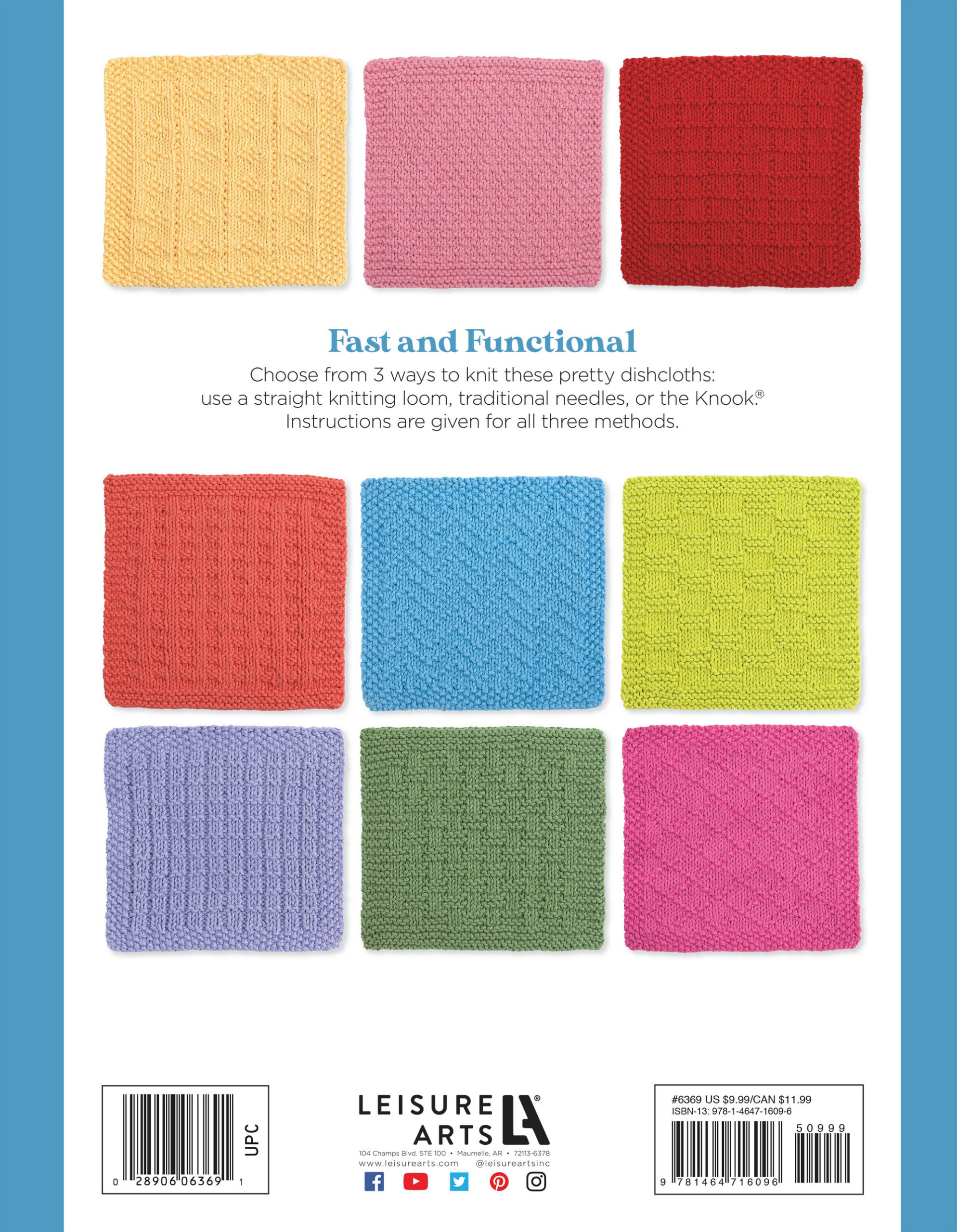 Loom Knit Dishcloths- Dishcloths are a fun way to learn new pattern stitches, which can be used in lots of other projects. 13 dishcloth designs feature a variety of pretty stitch patterns to make on a knitting loom. Designs use US size 4 medium weight cotton yarn and include: broken rib, chevron, dot stitch, elongated rib check, garter basket weave, ridged squares, Swedish block, pique stitch, waffle stitch, diamond panels, and more. Each pattern includes instructions for straight knitting looms, traditional knitting needles and the Knook. Finished project sizes measure between approximately 8 3/4"x 8 1/4" and 9"x 9". Easy skill level. 32 pages in a softcover.