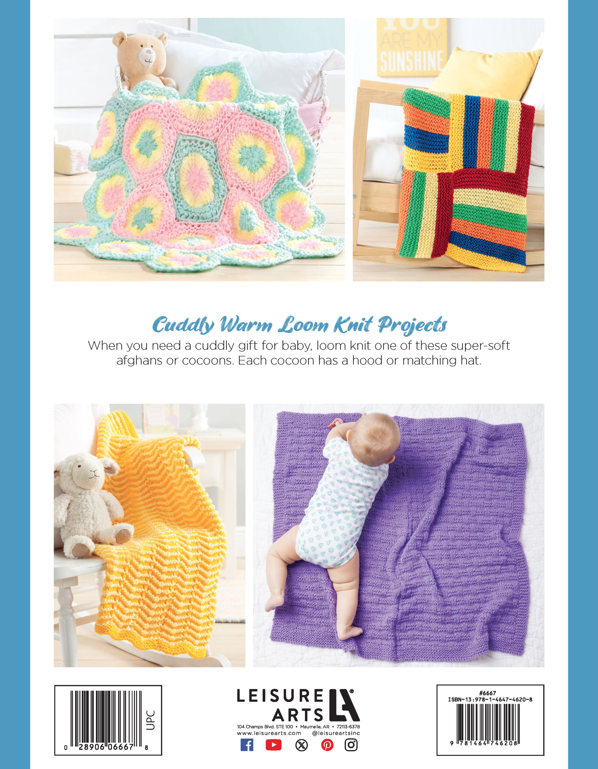 Loom Knit Baby Wraps- Choose from soft & sweet or bright & bold. When you need a cuddly gift to welcome a new baby into the world, choose one of these 6 afghans or 2 cocoons. They are quick to finish because you use bulky or super bulky yarn or two strands of light weight yarn. Round and straight looms of various sizes are required, and skill levels range from beginner to intermediate. Designs include: rainbow blocks, quilt star, bordered square, basketweave, ripples, hexagons, bunny cocoon, hat, and hooded cocoon. 32 pages in a softcover.
