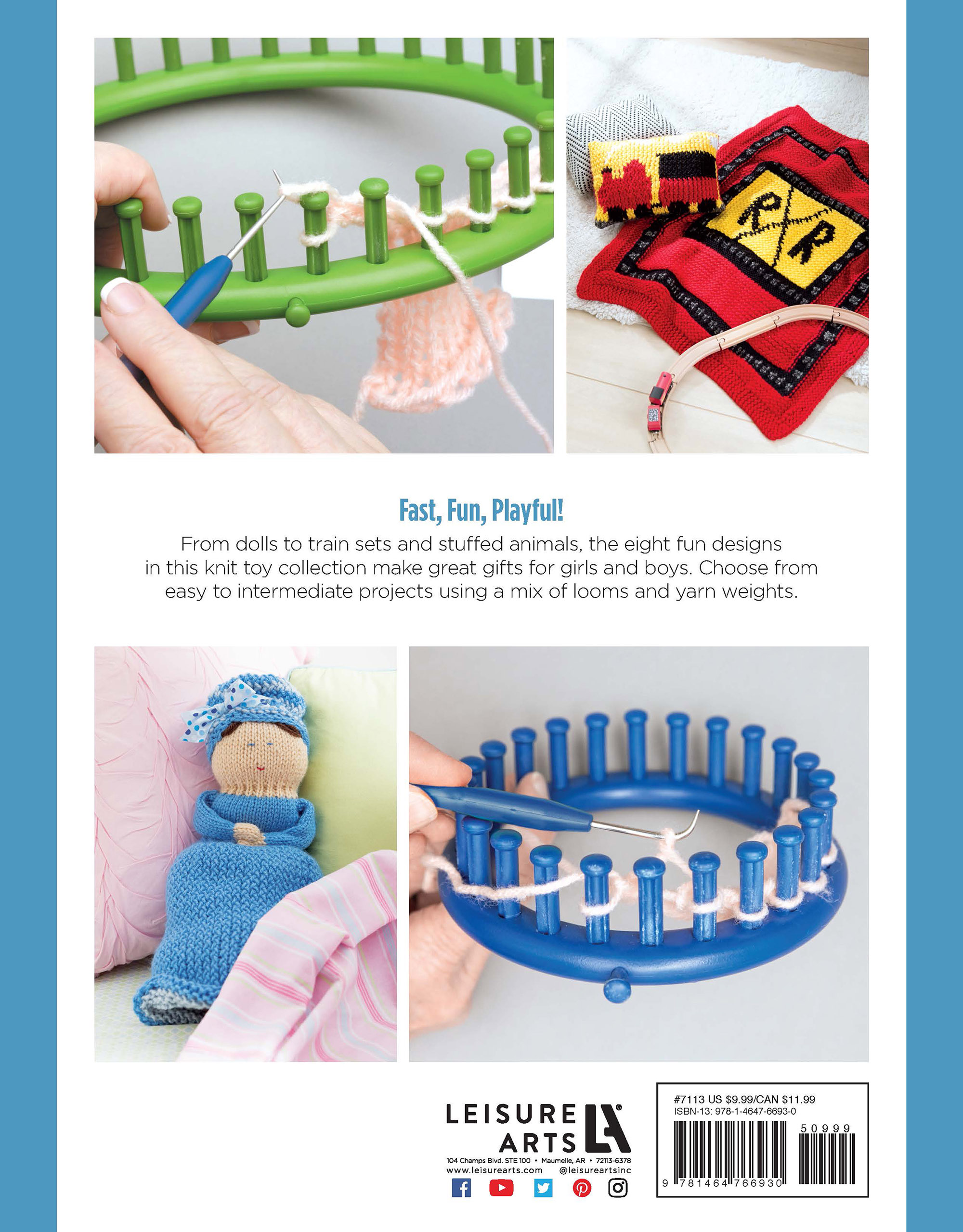 Loom Knit Toys- Soft and huggable, these designs make great gifts for girls and boys. Projects include: topsy-turvy doll, comfort kitty blanket buddy, cowboy stick pony and hat, roly-poly panda, puppy pillow pal, train pillow, and train track blanket. The eight fun choices are knit using round and oval looms with size 4 medium, 5 bulky, and 6 super bulky weight yarns. Skill levels range from easy to intermediate. 32 pages in a softcover.