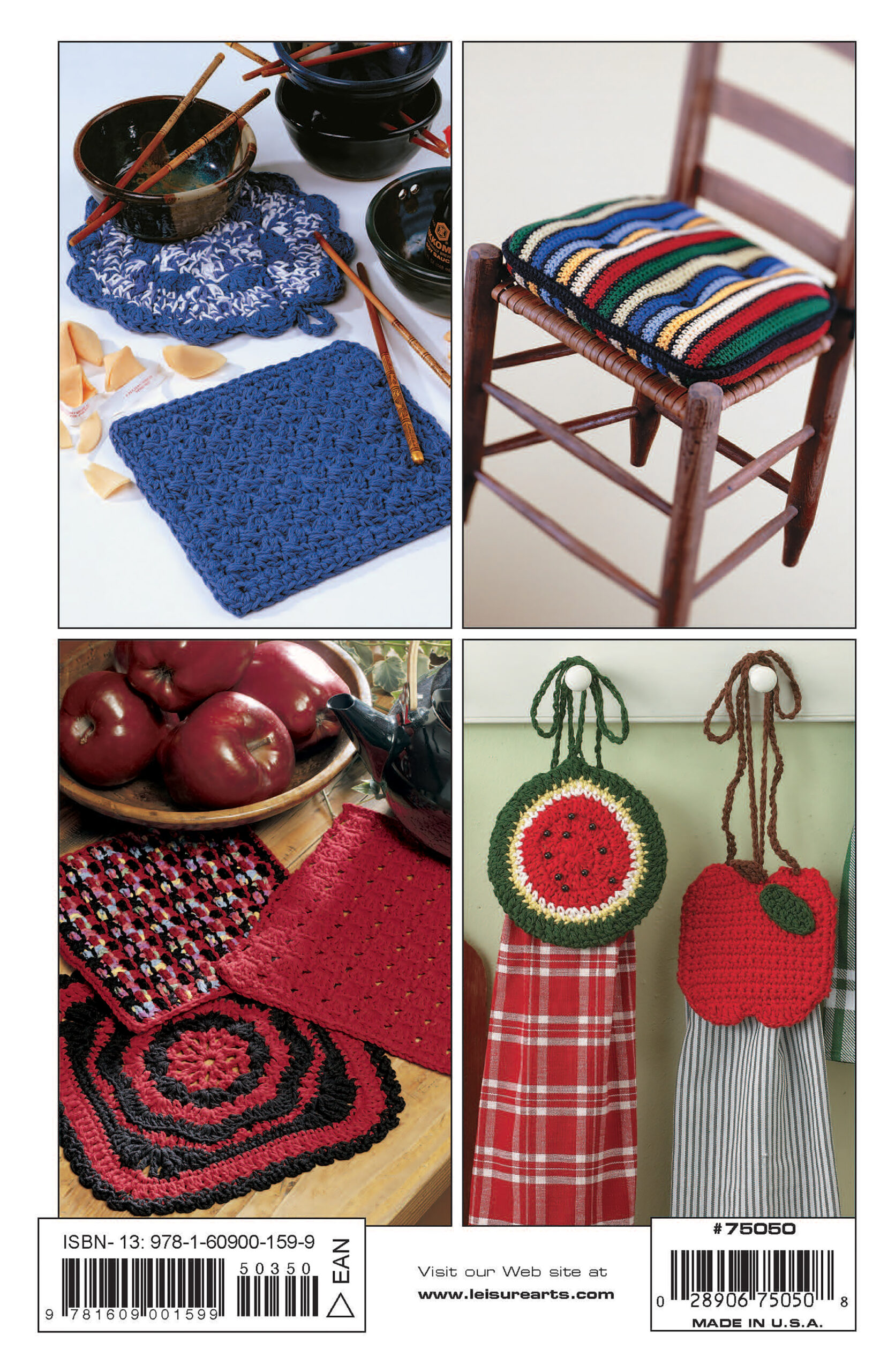 Crochet Little Kitchen Helpers Crochet- Brighten your kitchen with a tempting new menu of pretty and practical essentials. These handy helpers are quick-and-easy to finish, and they make great crochet gifts for busy chefs. From daisy sunshine scrubber to colorful potholders, towel toppers, dishcloths, and a striped chair cushion, they'll be right at your fingertips. Be creative by choosing yarn colors that harmonize with your kitchen. 28 pages, soft covers.