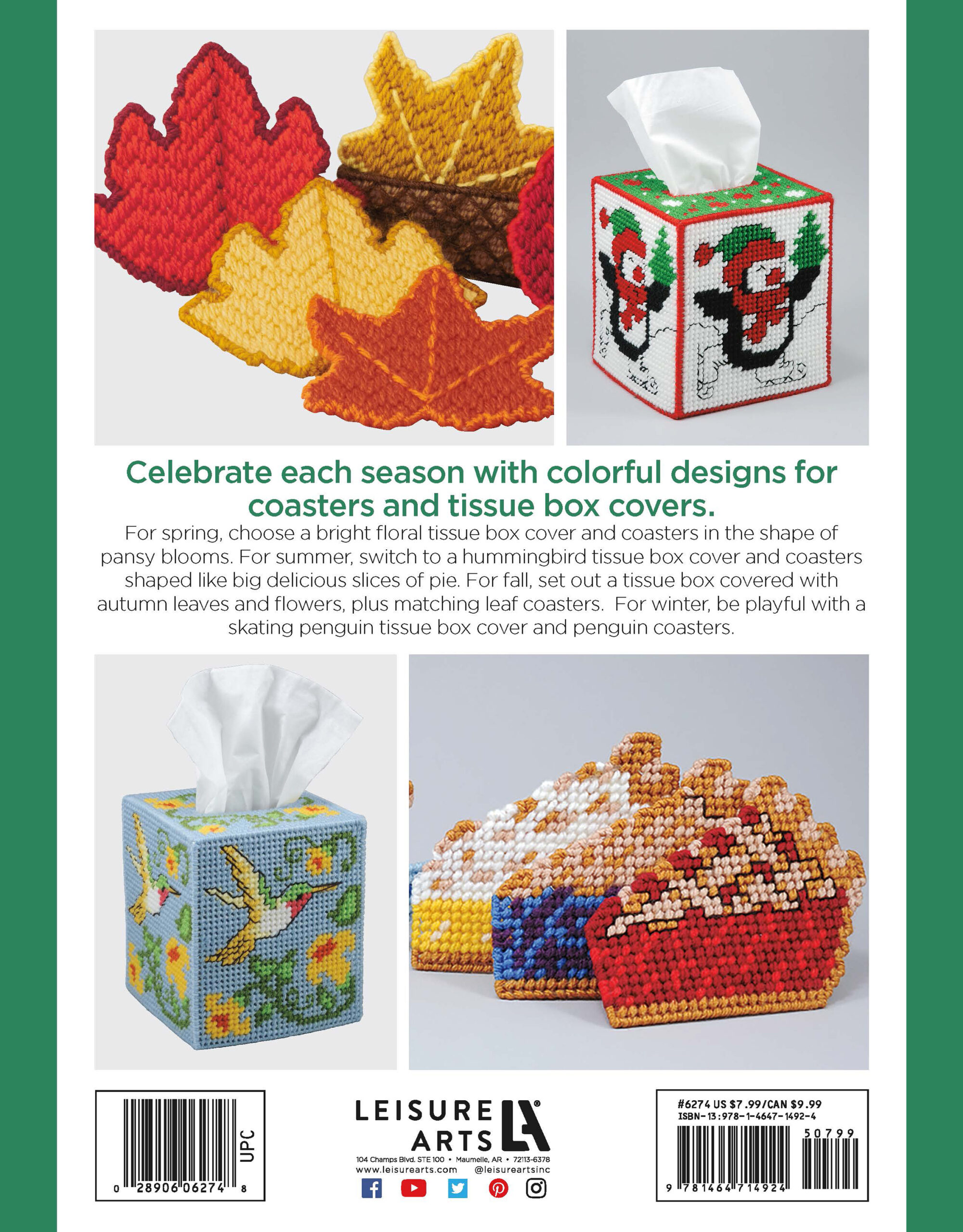 $7.99Stitchery Tissue Boxes & Coasters Plastic Canvas Herrschners- Celebrate each season with colorful plastic canvas designs for your home. Includes flowers for Spring, pie and butterflies for Summer, leaves and flowers for Autumn, and skating penguins for Winter. Coordinate your tissue box and coasters. All pieces are worked on 7-mesh plastic canvas using a size 16 tapestry needle and size 4 medium weight yarn. Floss details use 4 strands of cotton embroidery floss. 24 pages, soft cover.