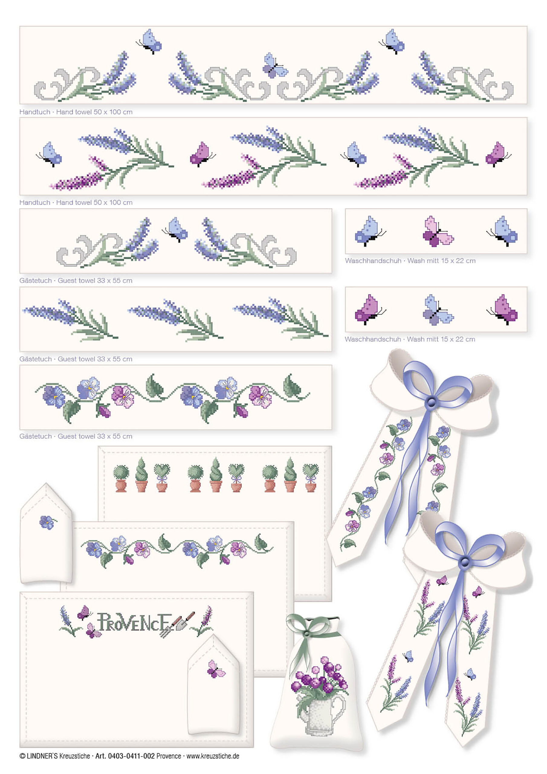 Lindner's Cross Stitch Charts feature classic embroidery themes and motifs reimagined by German designers Michael and Gudrun Lindner. All design charts are full-color counted cross stitch. Use these chart designs to add a decorative touch to curtains, table linens, kitchen towels, pillows and much more. Provence ePattern- Includes a variety of lavender and purple flower motifs with check prints, butterflies, gardening tools, flower pots and more. Large border design features lavender, butterflies and decorative swirls. Largest design measures approximately 49 x 249 stitches. Stitch each motif individually or combine them for a custom look. Includes a page with embroidery tips and tricks, illustrated stitch guides, color recommendations and general instructions in several languages. Pairs well with LIN000080 Lavender From Provence Stitch Chart. 5 pages, PDF download.