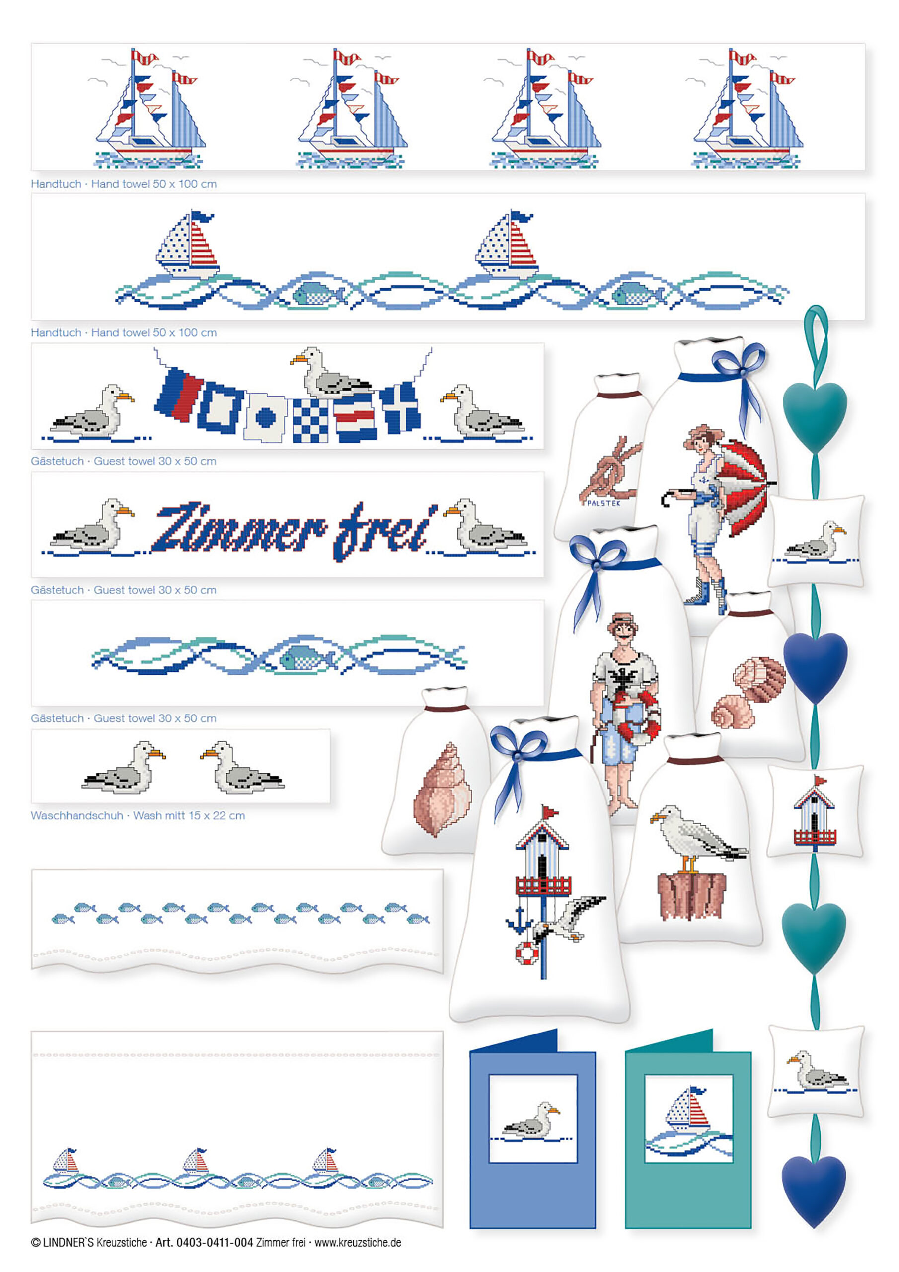 Lindner's Cross Stitch Charts feature classic embroidery themes and motifs reimagined by German designers Michael and Gudrun Lindner. All design charts are full-color counted cross stitch. Use these chart designs to add a decorative touch to curtains, table linens, kitchen towels, pillows and much more. Pauli & Paulinchen ePattern- Includes a variety of beach themed motifs like: seagulls, boy and girl sailors, a lighthouse, teddy bears, fish, coral, a sea lion and much more. Border designs include flag motif squares, tall beach houses, little seagulls, boats, and the caption: Aho. Stitch each motif individually or combine them for a custom look. Includes a page with embroidery tips and tricks, illustrated stitch guides, color recommendations and general instructions in several languages. Additionally includes uppercase, lowercase and block letter alphabet charts for customization. 5 pages, PDF download.