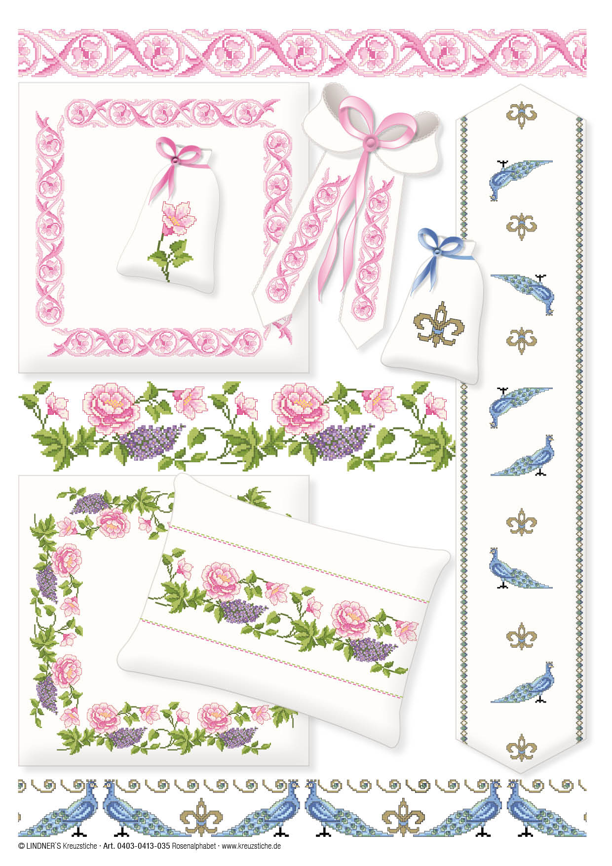 Lindner's Cross Stitch Charts feature classic embroidery themes and motifs reimagined by German designers Michael and Gudrun Lindner. All design charts are full-color counted cross stitch. Use these chart designs to add a decorative touch to curtains, table linens, kitchen towels, pillows and much more. Rose Garden ePattern- Includes an assortment of rose designs with other small flowers and floral wallpaper or tile patterns. Large border designs feature larger, repeatable, versions of the flower designs at the bottom of the sampler page and their coordinating patterns. Largest motif measures approximately 51 x 251 stitches. Stitch each motif individually or combine them for a custom look. Instructions include a page with embroidery tips and tricks, illustrated stitch guides, color recommendations and general instructions in several languages. 5 pages, PDF download.