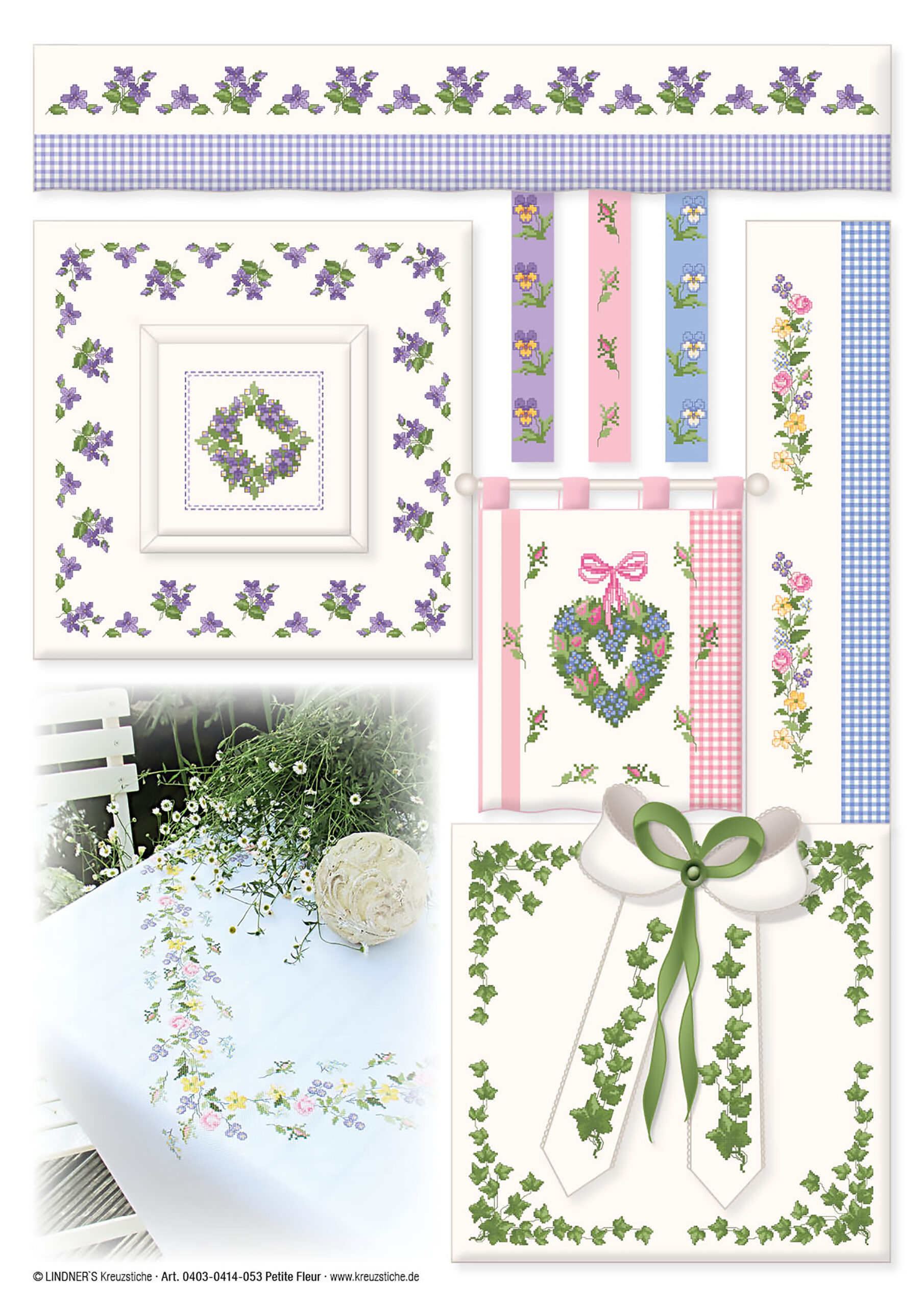 Lindner's Cross Stitch Charts feature classic embroidery themes and motifs reimagined by German designers Michael and Gudrun Lindner. All design charts are full-color counted cross stitch. Use these chart designs to add a decorative touch to curtains, table linens, kitchen towels, pillows and much more. Petite Fleur ePattern- Includes a variety of plant and flower designs like: pansy and orchid wreaths, lilly of the valley, roses, pansies, English ivy, tulips and more. Large border designs feature an assortment of flowers and ivy. Stitch each motif individually or combine them for a custom look. Instructions include a page with embroidery tips and tricks, illustrated stitch guides, color recommendations and general instructions in several languages. 5 pages, PDF download.