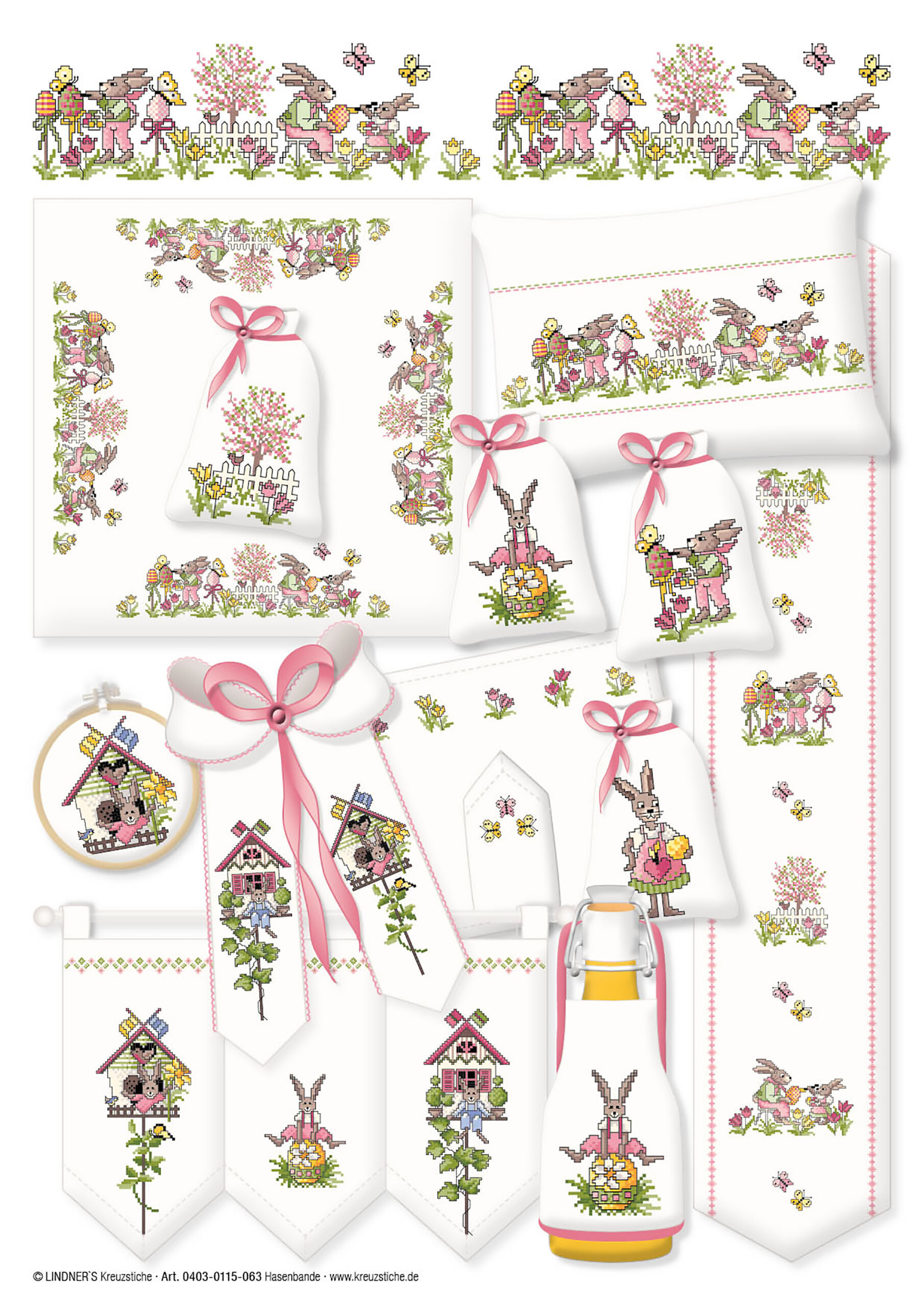 Lindner's Cross Stitch Charts feature classic embroidery themes and motifs reimagined by German designers Michael and Gudrun Lindner. All design charts are full-color counted cross stitch. Use these chart designs to add a decorative touch to curtains, table linens, kitchen towels, pillows and much more. Rabbit Gang ePattern- These adorable rabbit themed patterns include: rabbits in fancy clothes, rabbits gardening, birdhouses, flowers, hearts, Easter eggs and more. Large border design features a larger version of the rabbits painting Easter eggs motif. Largest motif measures approximately 49 x 265 stitches. Includes a page with embroidery tips and tricks, illustrated stitch guides, color recommendations and general instructions in several languages. 5 pages, PDF download.