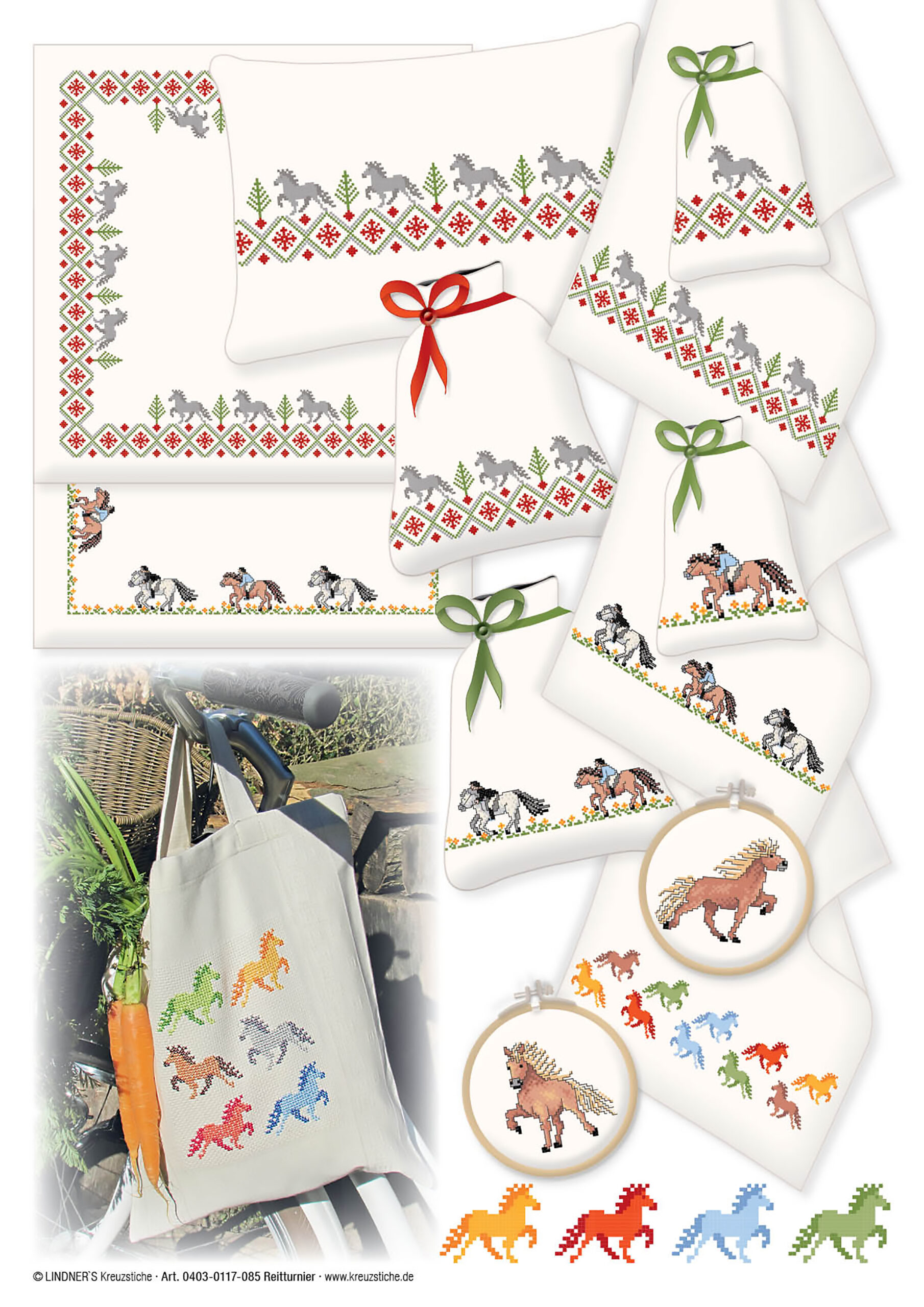 Lindner's Cross Stitch Charts feature classic embroidery themes and motifs reimagined by German designers Michael and Gudrun Lindner. All design charts are full-color counted cross stitch. Use these chart designs to add a decorative touch to curtains, table linens, kitchen towels, pillows and much more. Riding Tournament ePattern- Includes a variety of dressage designs like: horses, horse shoes, people horseback riding, obstacles, trophies and more. Borders include quilt star and Nordic snowflake inspired patterns. Large border design features a larger version of the two horseback riders motif. Stitch each motif individually or combine them for a custom look. Includes a page with embroidery tips and tricks, illustrated stitch guides, color recommendations and general instructions in several languages. Additionally includes uppercase, lowercase and block letter alphabet charts for customization. 5 pages, PDF download.