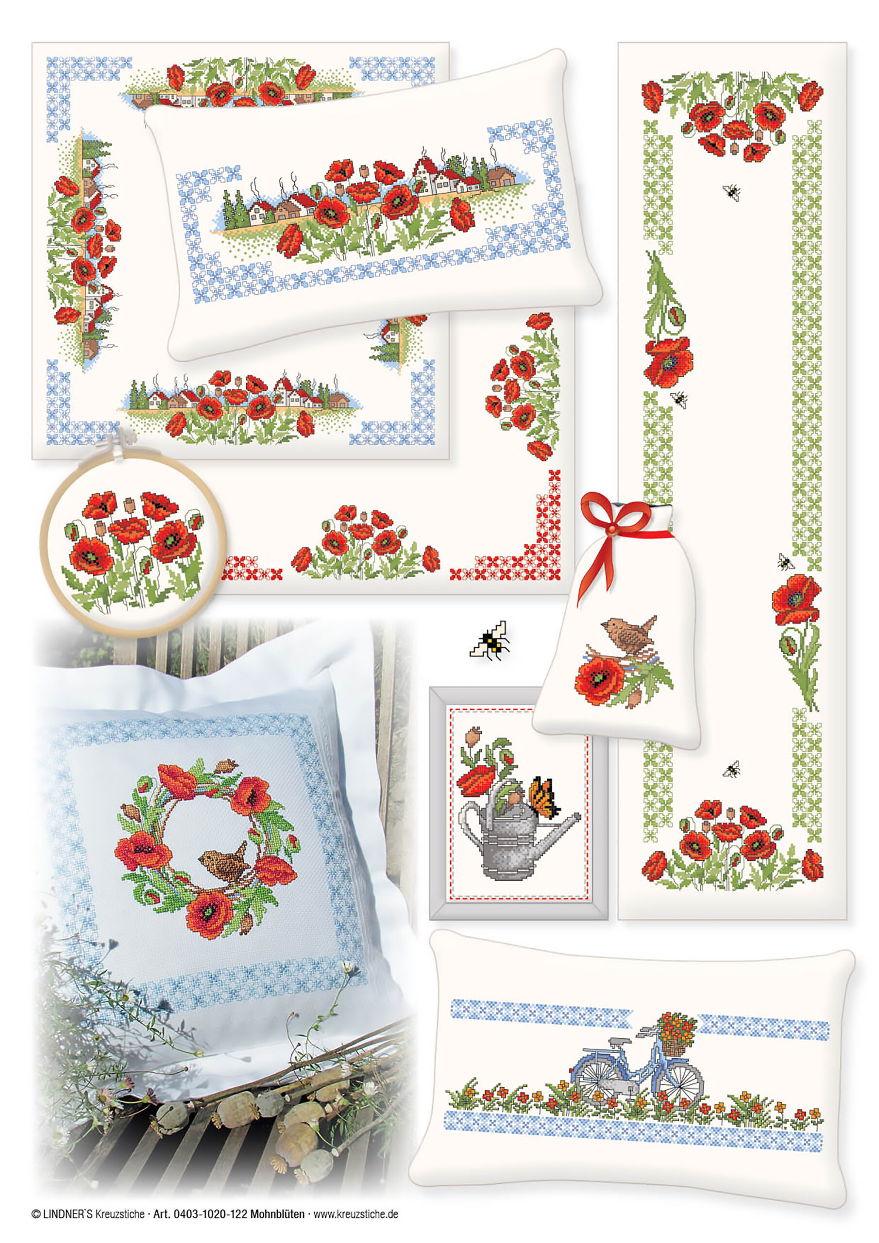 Lindner's Cross Stitch Charts feature classic embroidery themes and motifs reimagined by German designers Michael and Gudrun Lindner. All design charts are full-color counted cross stitch. Use these chart designs to add a decorative touch to curtains, table linens, kitchen towels, pillows and much more. Poppy Flowers ePattern- Includes a variety of country themed designs with poppy flower accents like: wreaths, a watering can, a bike with a basket, birds and cottages. Border designs feature floral tile prints and ombre swirl patterns. Large borders feature larger, repeatable, versions of the poppy and swirl design, the floral tile print and the cottage landscape. Largest design measures approximately 51 x 251 stitches. Stitch each motif individually or combine them for a custom look. Instructions include a page with embroidery tips and tricks, illustrated stitch guides, color recommendations and general instructions in several languages. 5 pages, PDF download.