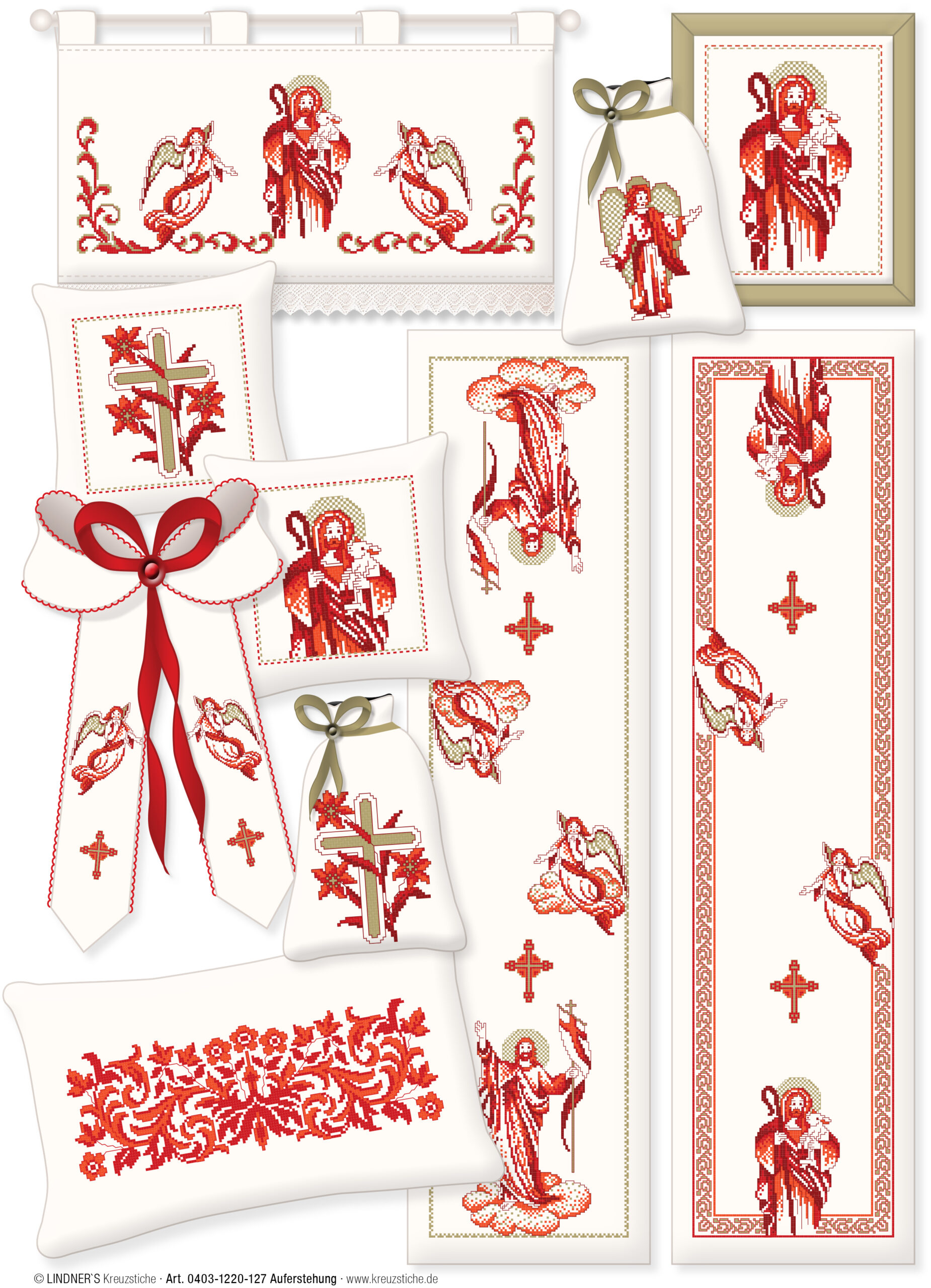 Lindner's Cross Stitch Charts feature classic embroidery themes and motifs reimagined by German designers Michael and Gudrun Lindner. All design charts are full-color counted cross stitch. Use these chart designs to add a decorative touch to curtains, table linens, kitchen towels, pillows and much more. Resurrection ePattern- Includes a variety of Christian motifs like: several depictions of Jesus Christ, crosses, a block of ornate flowers, angels, fish and more. Designs can be stitch independently, or stitched cohesively on one project with ornate filler and borders. Includes a page with embroidery tips and tricks, illustrated stitch guides, color recommendations and general instructions in several languages. 5 pages, PDF download.