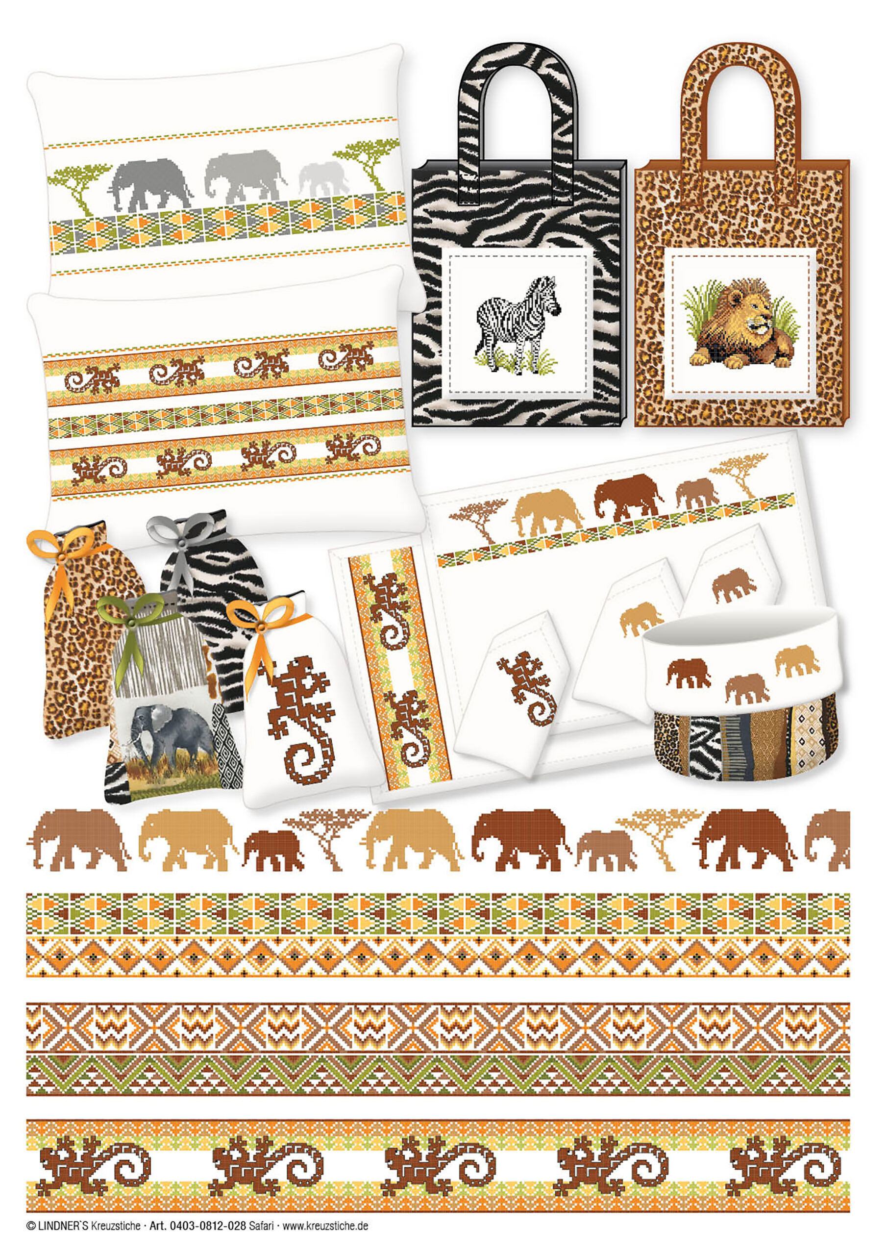 Lindner's Cross Stitch Charts feature classic embroidery themes and motifs reimagined by German designers Michael and Gudrun Lindner. All design charts are full-color counted cross stitch. Use these chart designs to add a decorative touch to curtains, table linens, kitchen towels, pillows and much more. Safari ePattern- Stitch up a lion, tiger, zebra and elephant alongside African patterns and more with this collection of charts. Includes a page with embroidery tips and tricks, illustrated stitch guides, color recommendations and general instructions in several languages. Additionally includes more sizes for the elephant silhouette motif. 5 pages, PDF download.