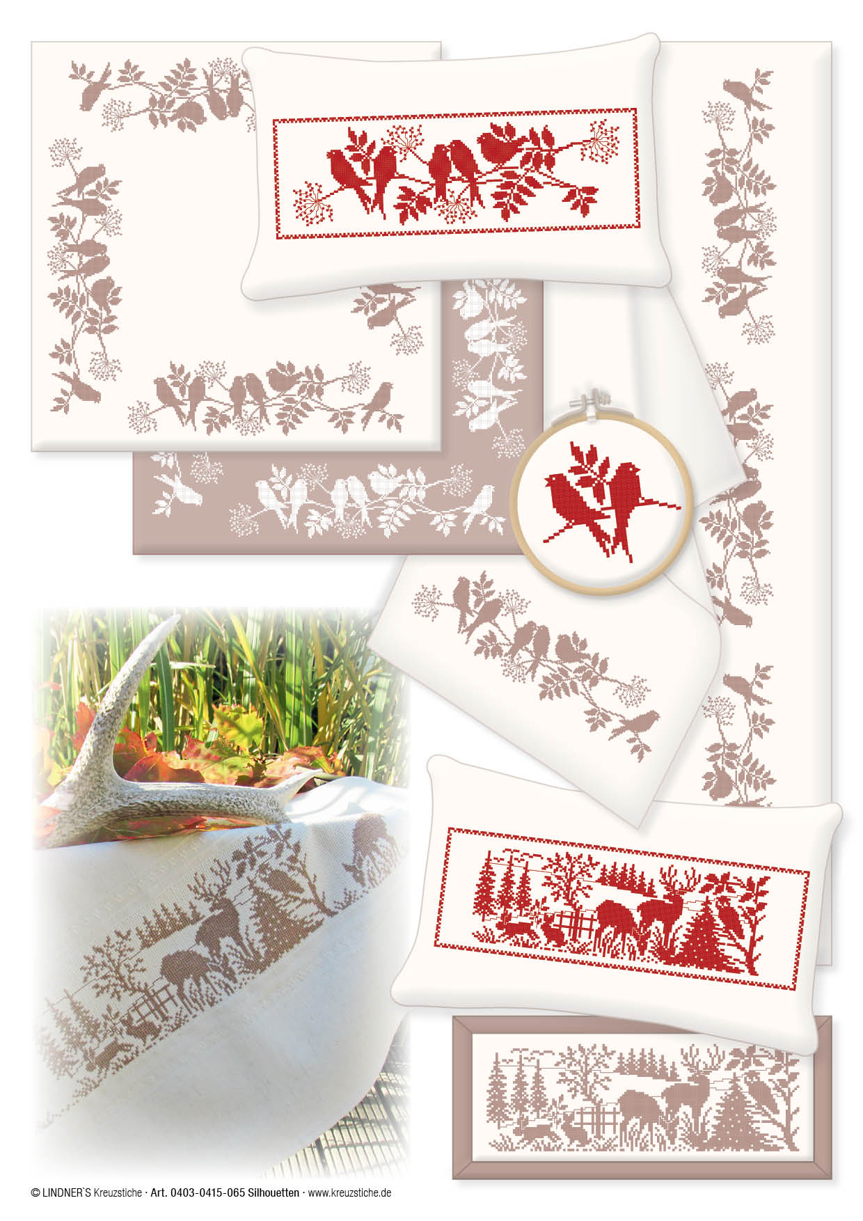 Lindner's Cross Stitch Charts feature classic embroidery themes and motifs reimagined by German designers Michael and Gudrun Lindner. All design charts are full-color counted cross stitch. Use these chart designs to add a decorative touch to curtains, table linens, kitchen towels, pillows and much more. Silhouettes ePattern- Includes a wide range of beautiful motifs like: Lady in the garden with geese, farmer leading his flock of animals, grazing deer in the meadow with rabbits, and birds on a branch. Each design can be used as a border or as the focal point with a checkered boarder. Includes a page with embroidery tips and tricks, illustrated stitch guides, color recommendations and general instructions in several languages. 5 pages, PDF download.