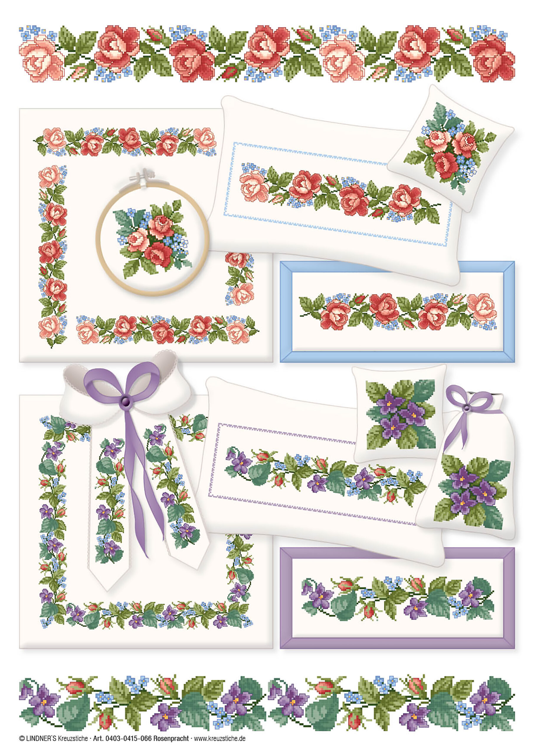 Lindner's Cross Stitch Charts feature classic embroidery themes and motifs reimagined by German designers Michael and Gudrun Lindner. All design charts are full-color counted cross stitch. Use these chart designs to add a decorative touch to curtains, table linens, kitchen towels, pillows and much more. Splendor Of Rose ePattern- Includes an assortment of rose designs with other small four and five petal flowers. Border design features large multi-colored swirls. Stitch each motif individually or combine them for a custom look. Instructions include a page with embroidery tips and tricks, illustrated stitch guides, color recommendations and general instructions in several languages. Additionally includes four large repeatable border designs with the same rose motifs. 5 pages, PDF download.