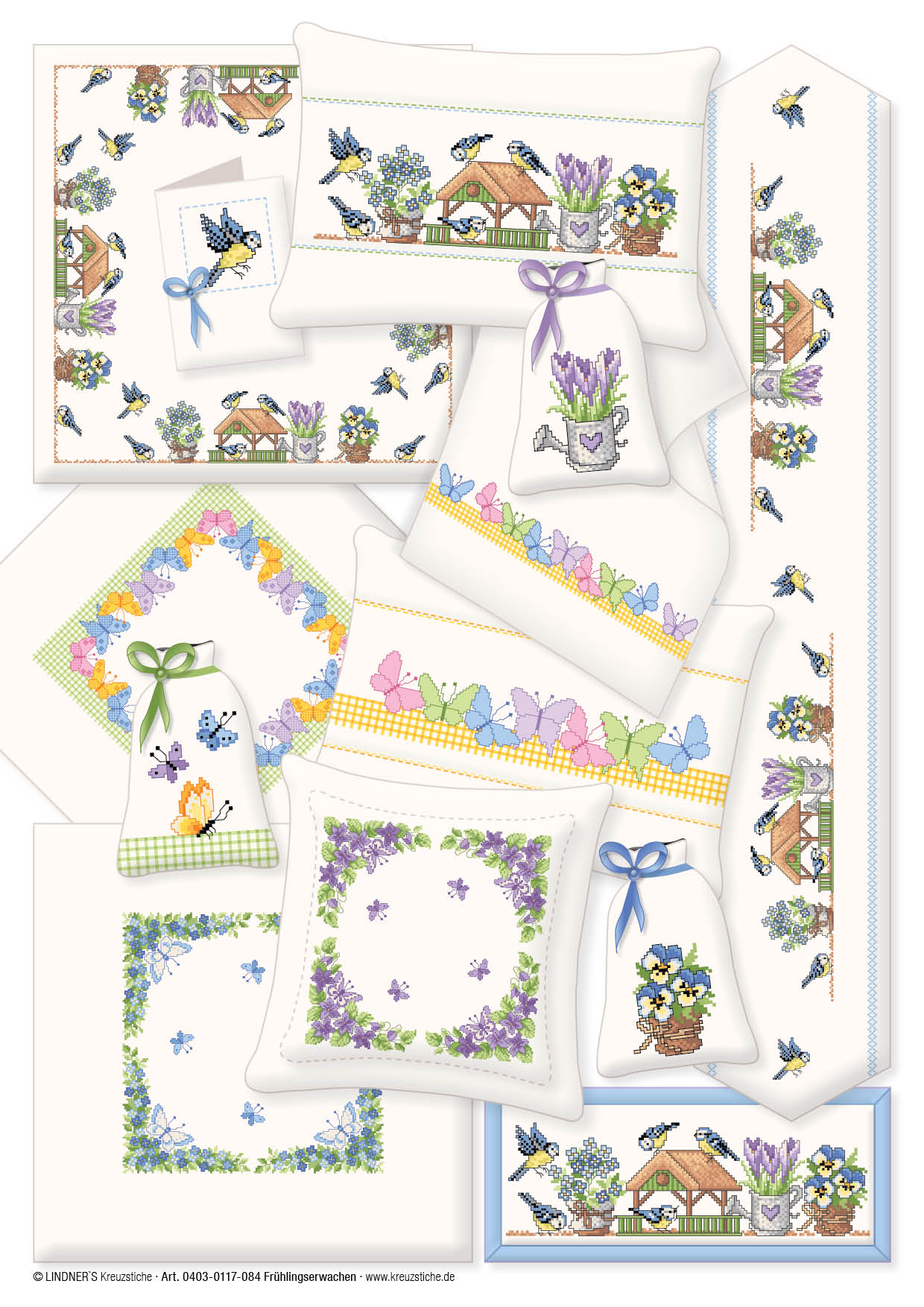 Lindner's Cross Stitch Charts feature classic embroidery themes and motifs reimagined by German designers Michael and Gudrun Lindner. All design charts are full-color counted cross stitch. Use these chart designs to add a decorative touch to curtains, table linens, kitchen towels, pillows and much more. Spring Awakening ePattern- Includes a wide range of beautiful Spring motifs like: small flower wreaths with birds, rabbits in flowers, birds around a garden birdhouse and butterflies. Border designs include 3 variations of flowers and butterflies, with large border designs that repeat the bunny and bird motifs. Largest motif measures approximately 51 stitches wide x 251 stitches tall. Includes a page with embroidery tips and tricks, illustrated stitch guides, color recommendations and general instructions in several languages. 5 pages, PDF download.