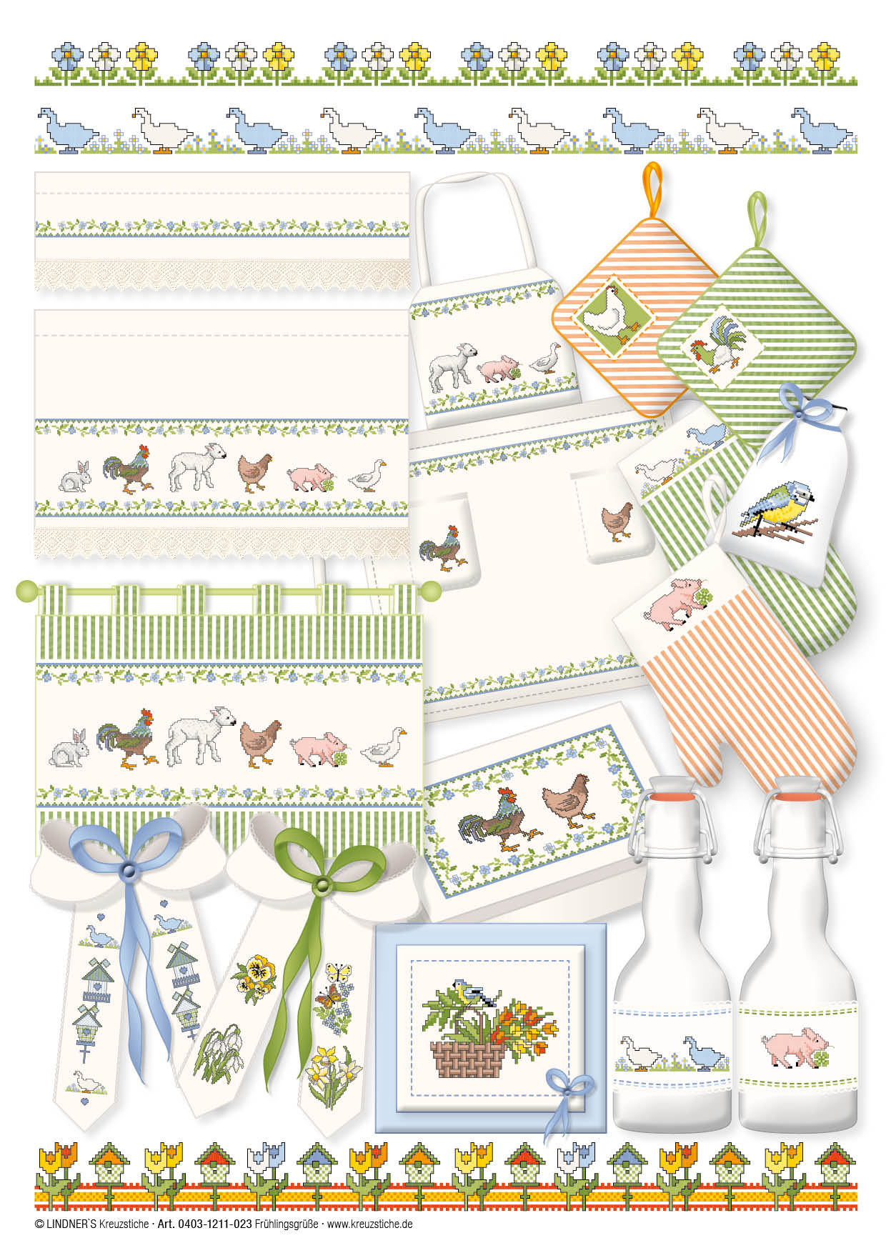 $7.99Lindner's Cross Stitch Charts feature classic embroidery themes and motifs reimagined by German designers Michael and Gudrun Lindner. All design charts are full-color counted cross stitch. Use these chart designs to add a decorative touch to curtains, table linens, kitchen towels, pillows and much more. Spring Greetings ePattern- Includes a wide range of beautiful Spring motifs like: a lamb, baby pig, rooster, hen, rabbit, birds, daffodils, butterflies, ducks, birdhouses and small decorative flowers. Border design include a patchwork or tile-like motifs, tulips, chickens birdhouse and more. Includes a page with embroidery tips and tricks, illustrated stitch guides, color recommendations and general instructions in several languages. 5 pages, PDF download.