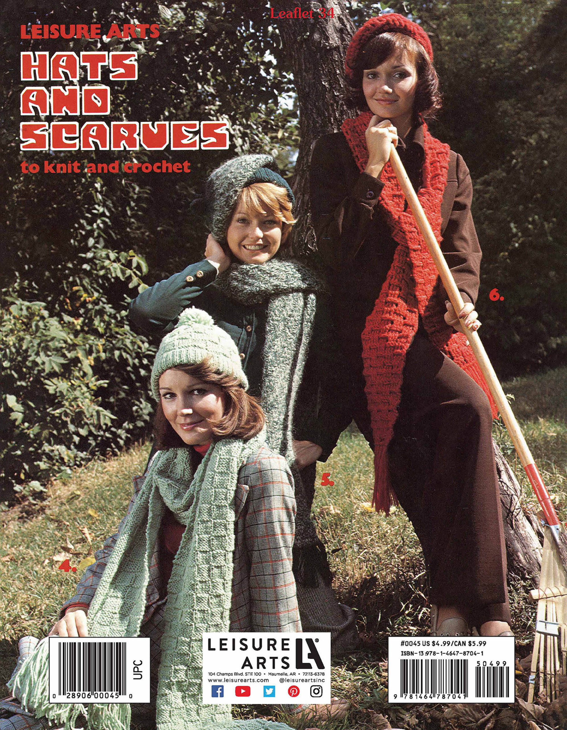 $3.99Leisure Arts Hat & Scarf Sets Glamour Set Crochet ePattern- A vintage hat and scarf set ePattern. Design features a tall brimless cap with embroidered floral accents and a matching scarf. Crochet project calls for size 4 worsted weight yarn and US size H-8 and J-10, 5 millimeter and 6 millimeter, crochet hook. Originally published in Leisure Arts Leaflet 2102, Hat & Scarf Sets to Knit & Crochet Book 2. 4 pages, PDF download.