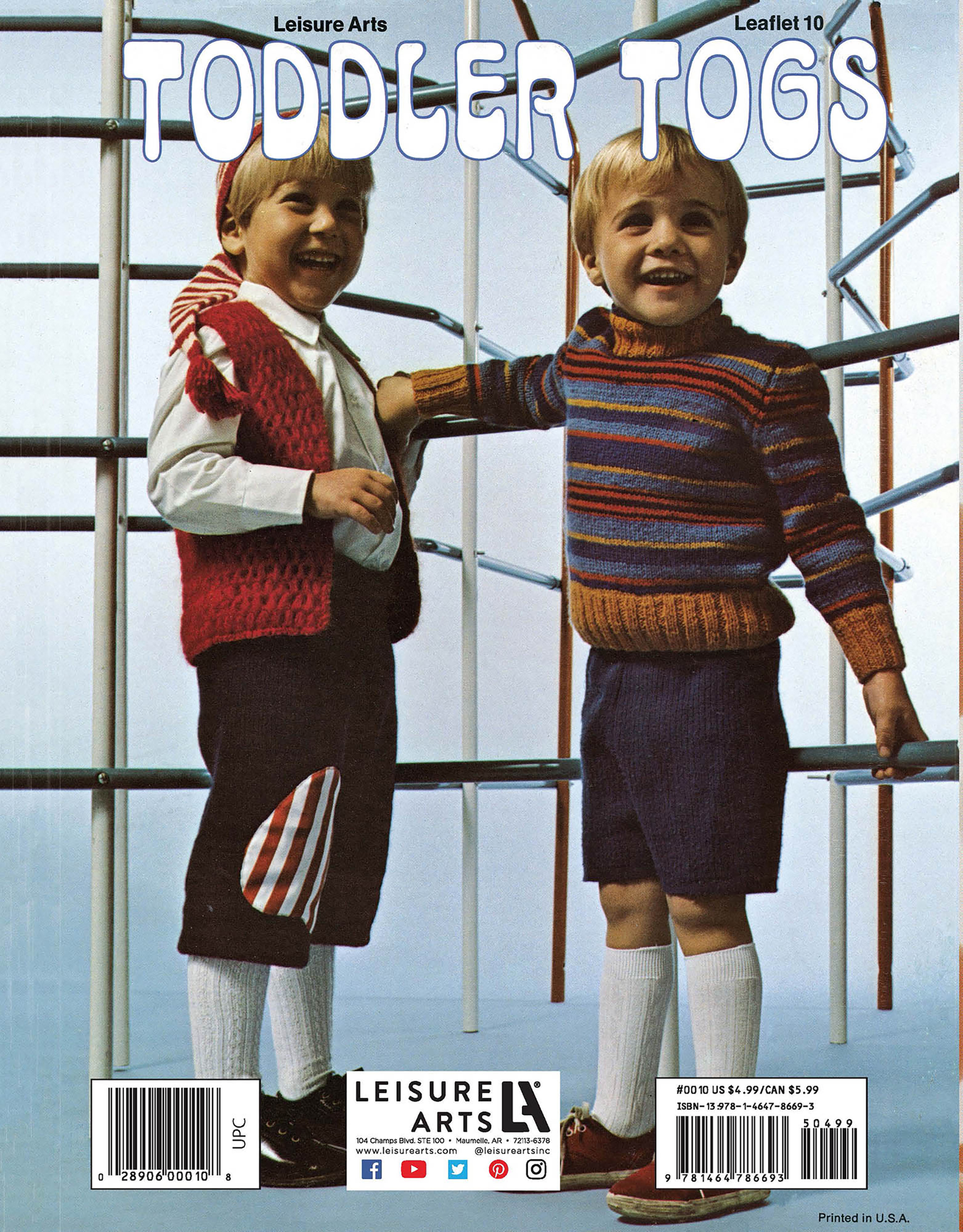 $7.99Leisure Arts Toddler Togs Knit & Crochet eBook- Stitch up adorable outfits for your favorite toddlers with this collection of vintage patterns from Leisure Arts. Designs include: lacy shell crocheted dress and bell-bottom pants, crocheted shag vest and striped bell-bottoms, knitted mohair vest and pants outfit, and knitted multi-stripes sweater. Projects call for size 1 super fine, 2 sport, and 4 worsted weight yarn, crochet hooks in US size E-4, and G-6, and straight knitting needles in US sizes 1, 3, 4, and 5. Includes step-by-step instructions for each design in toddler sizes 2 and 4. Vintage sizes run small, so adjust each pattern as needed adding or removing stitches, or by changing your hook size. Gauge swatches are recommended. Intermediate skill level. Originally published as Leisure Arts Leaflet 10, Toddler Togs. 6 pages, PDF download.
