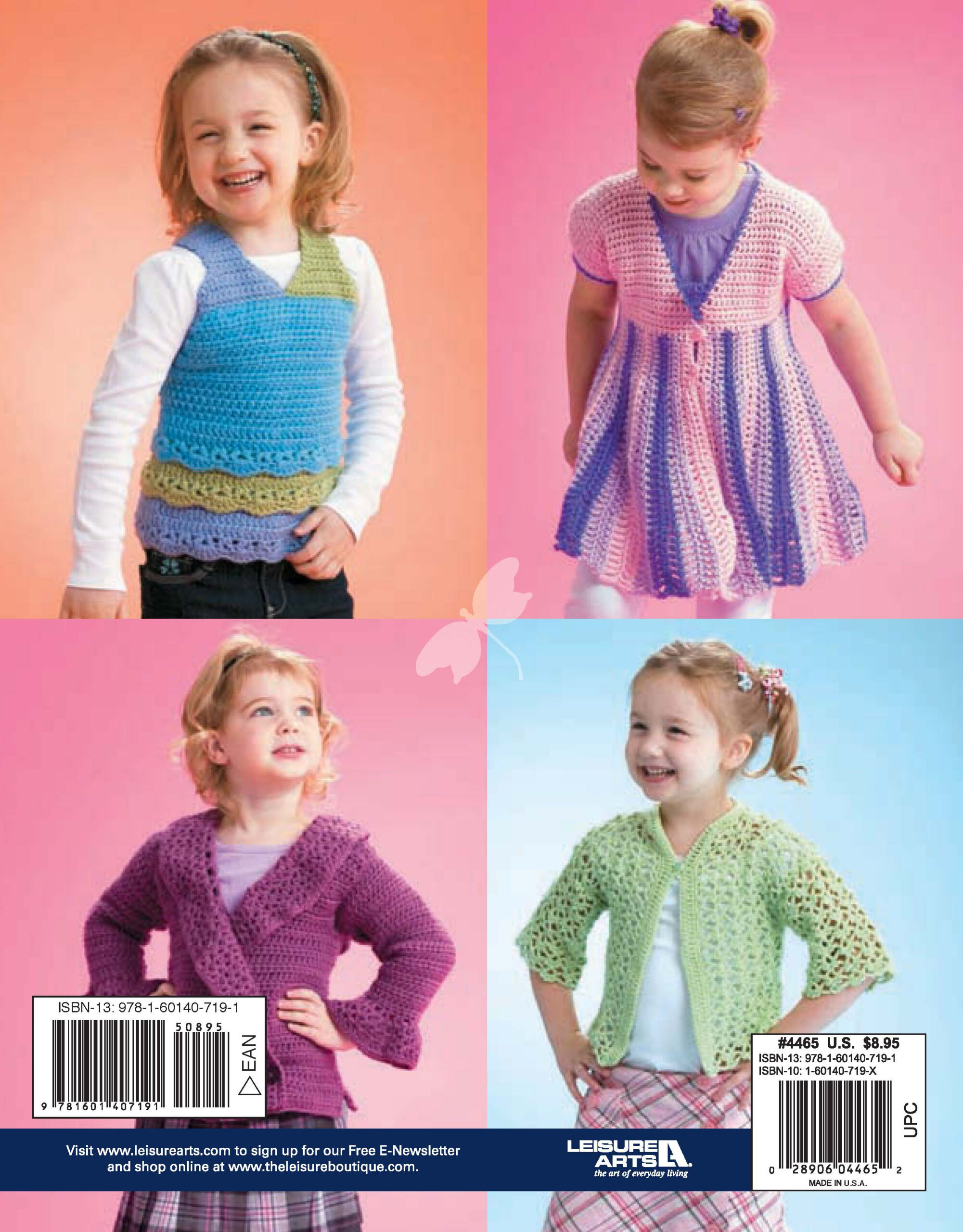 $7.99Leisure Arts Top-sy Turvy Crochet eBook- 5 crochet sweaters for girl's sizes 2-10. Created with special features such as multicolor edgings, ruffles, stripes, easy embroidery, and an optional belt, these feminine fashions will go great with your little ladies' wardrobe staples. Designs include: tiered halter, sweetheart sweater, ruffled cardigan, lacy sweater and sassy stripes. Projects call for size 3 light and 4 worsted weight yarns and crochet hooks in US sizes F-5 and G-6. Includes step-by-step instructions for each size, stitch guides diagrams and full color photos for each design. Sizing options fit chests ranging between approximately 18" to 30 1/2". Intermediate skill level. 30 pages, PDF download.