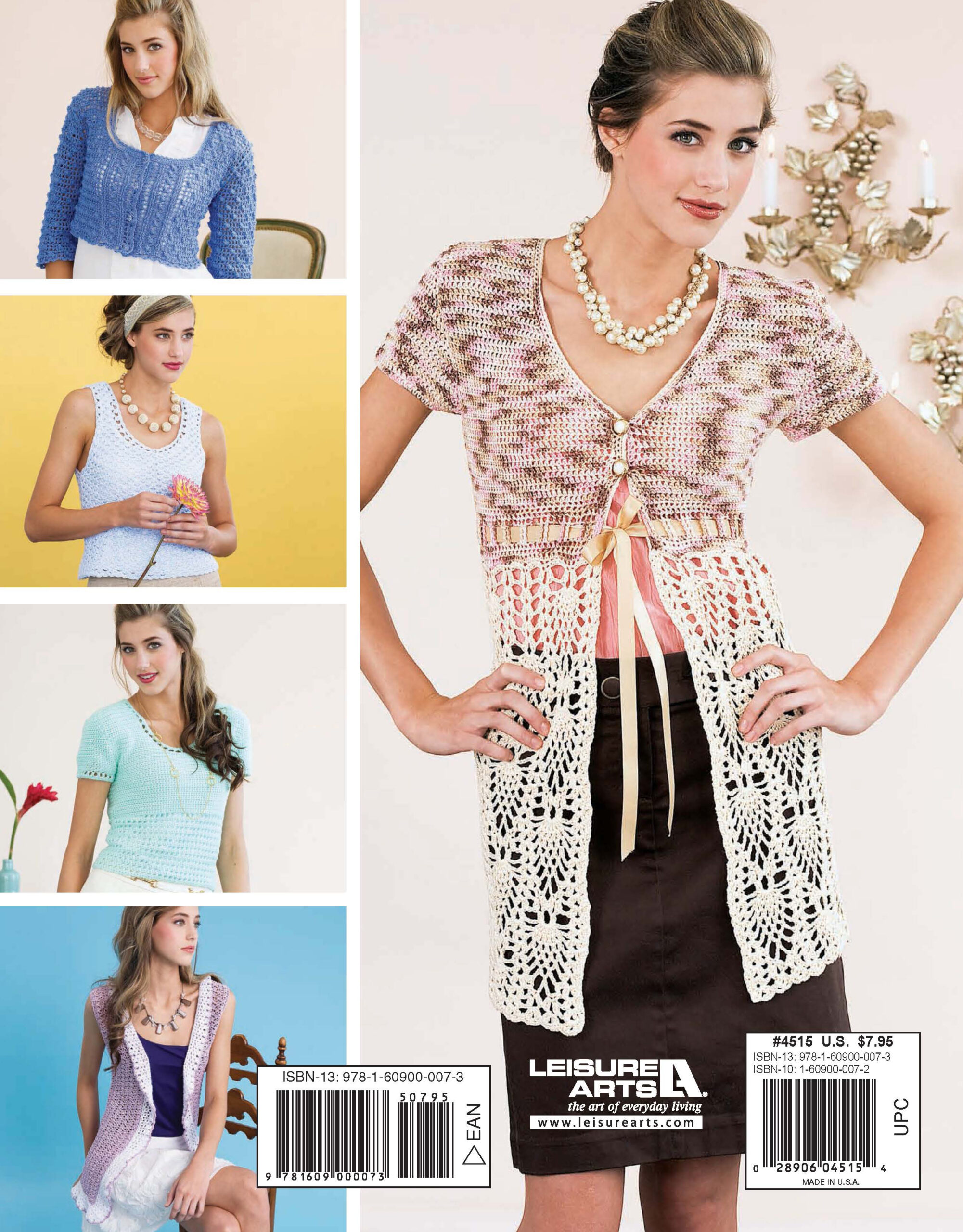 Leisure Arts Easygoing Fashions Crochet eBook- 6 breezy, easygoing sweaters are yours to create with crochet. These summer-fresh designs will mix and match with all your favorite separates. Two cropped sweaters, a sleeveless shell, long vest, mid-thigh top, and short sleeve pullover give you options to suit your mood. Wear them casual with denim or go a little dressy with slacks or skirts. The versatile pieces also make great gifts for your fashion-conscious friends. Projects call for size 1 super fine, 2 fine and 3 light weight yarns and crochet hooks in US sizes F-5, G-6 and I-9. Includes step-by-step instructions for each design, panel piecing diagrams and sizing options for US sizes X-Small through X-Large. Sizes fit chests measuring between approximately 31" and 44 1/2". Intermediate skill level. Also available as a physical copy: LEA4515 Leisure Arts Easygoing Fashions Crochet Book. 42 pages, PDF download.