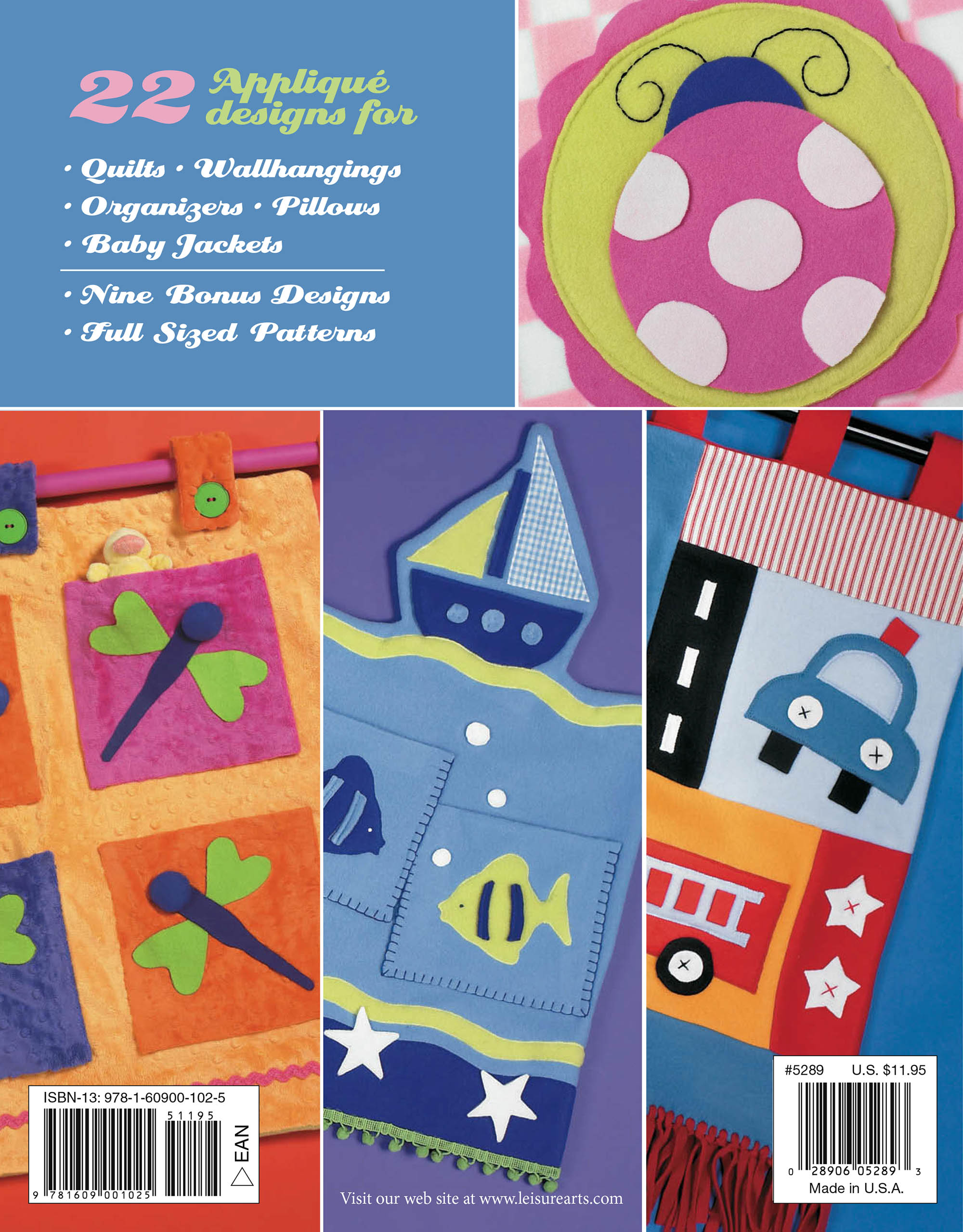 Leisure Arts Easy Fleece for Baby eBook- 22 soft and cuddly appliques to embellish all of your baby projects. Includes templates, general instructions and individual instructions for each pattern. Designs include: lady bugs, butterflies, sail boats, fish, cats, dogs, police cars, stars, panda, birds and more. Larger project instructions are also included and can be made with any of the appliques. These projects include: wall hanging, pillows, small blankets, sweaters, booties, a tote and more. Requires both machine and hand stitching. 66 page PDF download.