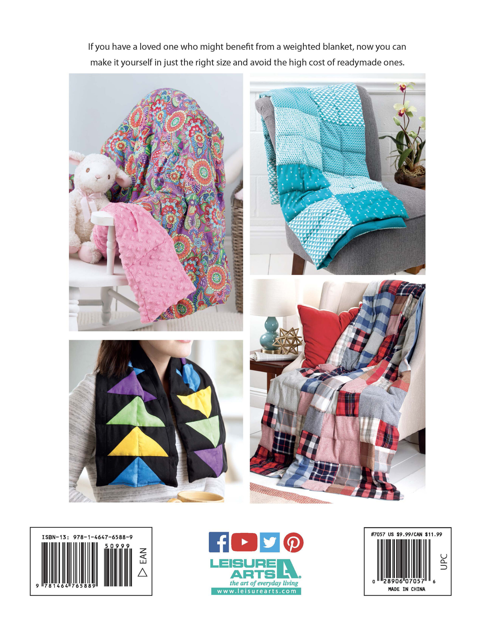Leisure Arts eBook Weighted Blanket- Therapeutic quilts in just the right size for children and adults. Weighted blankets are popular to help with anxiety, sensory problems, restless legs, autism, and other disorders. Designs include Super Simple, Teal Squares, Charm Squares, Plaid Flannels, Rail Fence, Soccer Balls, Patriotic, Lap Blanket, and Neck Wrap. Most projects include tables of supplies and measurements for making multiple sizes for youth and adults. 38 page, PDF Digital Douwnload
