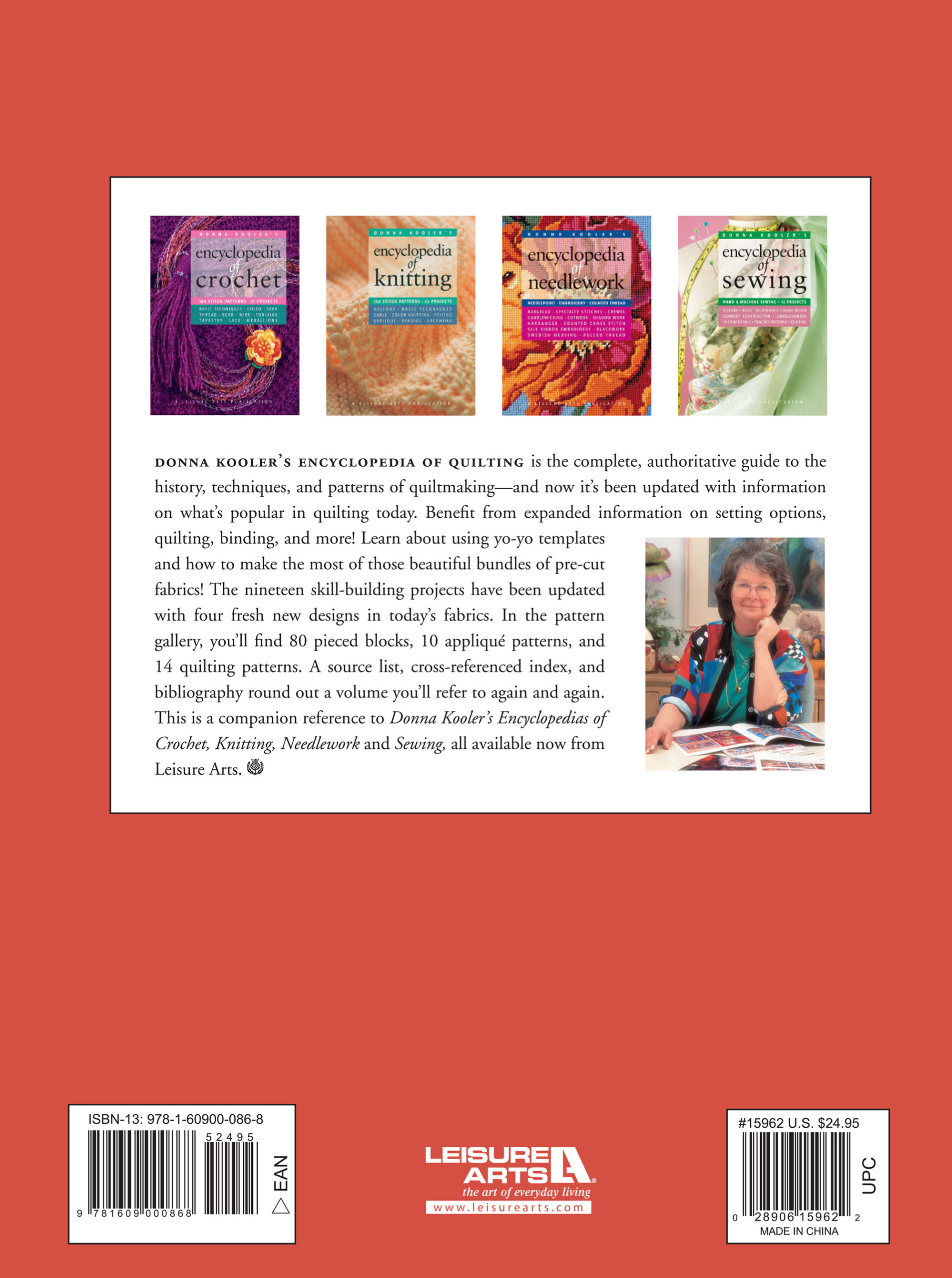 Leisure Arts eBook Encyclopedia Of Quilting- Updated and Revised. A complete authoritative guide to the history, techniques, and patterns of quiltmaking. 19 skill-building projects have be updated with 4 fresh new designs all in today's fabrics. In the pattern gallery you'll fine 80 pieced blocks, 10 applique patterns, and 14 quilting patterns. You'll also benefit from expanded information on setting options, quilting, binding, and more, as well as learning about yo-yo templates and how to make the most of those beautiful bundles of pre-cut fabrics. 243 page, PDF Digital Download.
