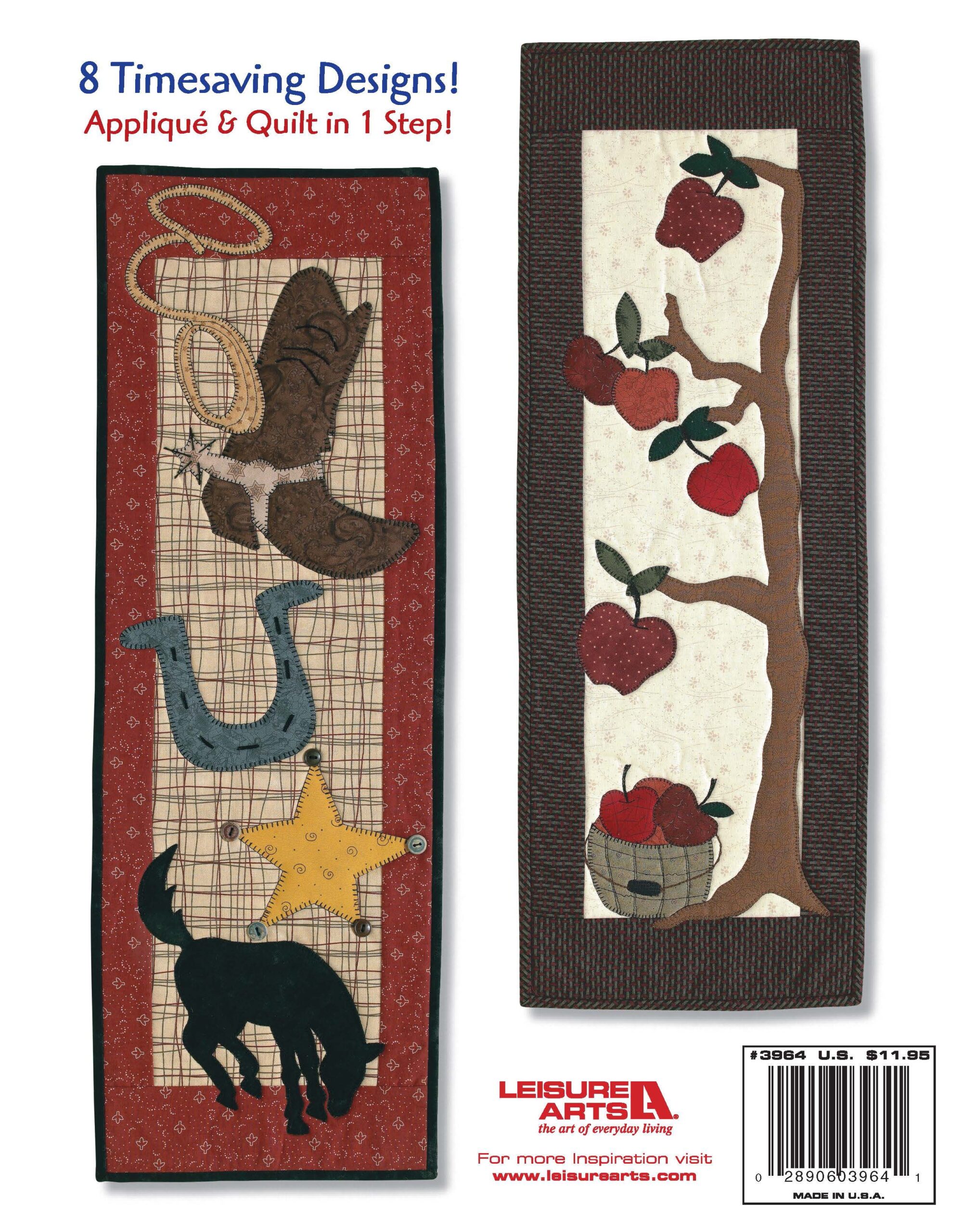 Leisure Arts Special Occasion Wall Hangings Quilt eBook- 8 quick and easy seasonal wall quilts for every occasion. Designs include: better bushels, autumn blaze, Christmas tree, hot stuff, ride'em cowboy, tools of the trade, and waves of glory. Each wall quilt is construct with a simple center panel of fabric, a thick 4 piece border and its own decorative applique designs. Applique designs include: apples, trees, pumpkins, poinsettias, stars, peppers, horses and much more. Includes step-by-step instructions, diagrams and printable applique templates for each design, as well as a general guide to quilting basics. Finished wall hangings measure approximately 10 1/2"x 29". 54 pages, PDF download.