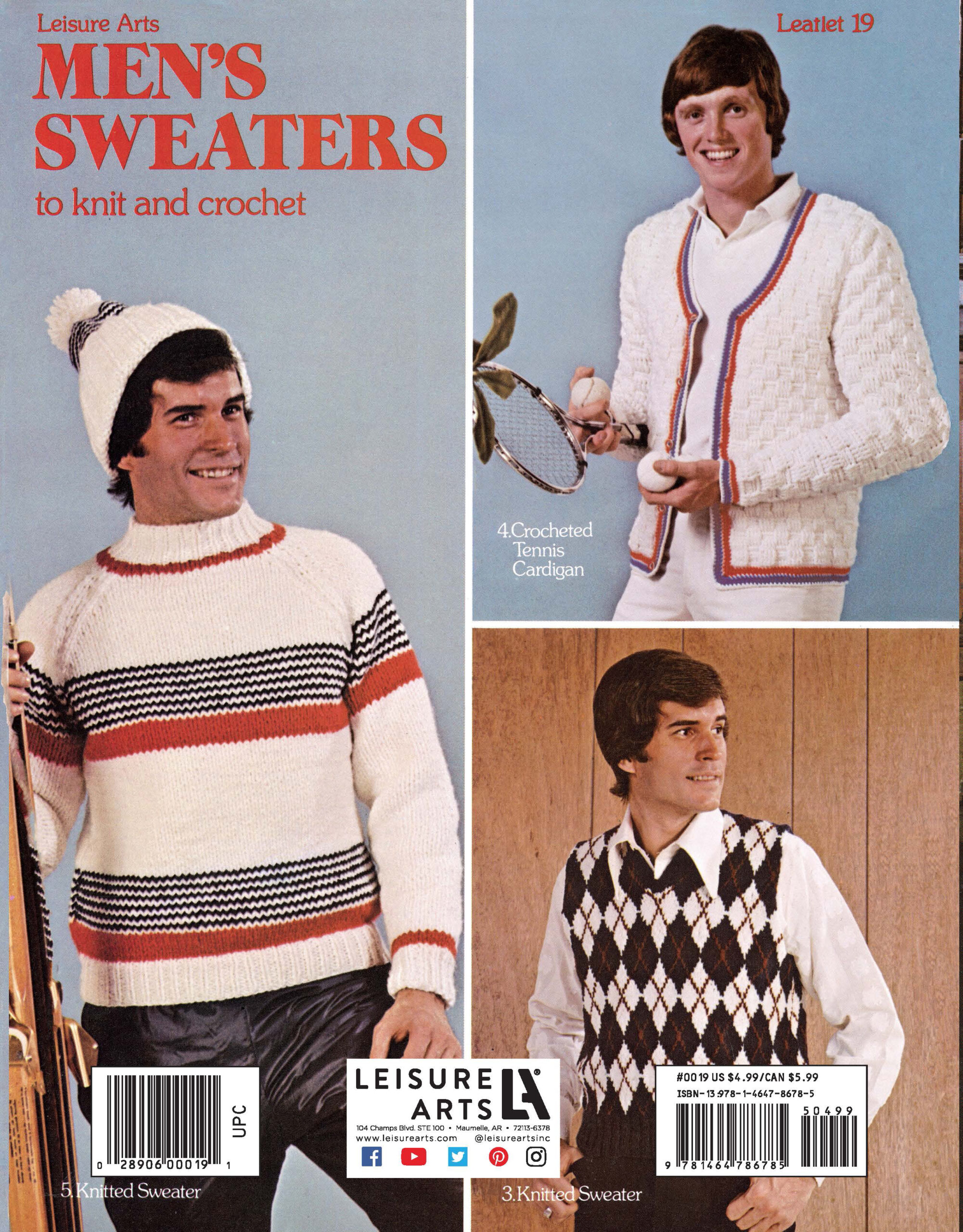 Leisure Arts Men's Sweater To Knit And Crochet eBook- Create a collection of vintage men's sweaters and vests with this original leaflet from Leisure Arts. Designs include: crocheted cardigan, crocheted belted vest, knitted ski sweater And cap, crocheted tennis cardigan, and knitted argyle vest. Projects call for size 2 sport and 4 worsted weight yarns, US size 2 , 5, 10, and 11 straight and circular knitting needles, and US size G-6, F-5, H-8 and J-10 crochet hooks. Includes row-by-row knit or crochet instructions for each design. Sizing options include US Men's 38, 40, 42 and 44. Originally published as Leisure Arts Leaflet 19, Men's Sweaters To Knit And Crochet. 4 pages, PDF download.