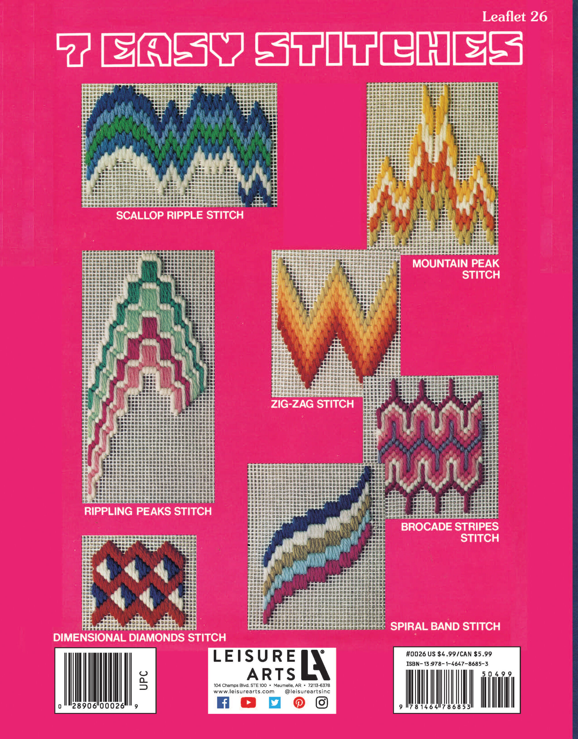 $7.99Leisure Arts Teach Yourself To Bargello Stitchery eBook- Learn to create bargello designs with step-by-step instructions for stitches and projects. 7 easy stitches include scallop ripple, mountain peak, rippling peaks, zig-zag, brocade stripes, dimensional diamonds, and spiral band. Projects include pin cushion in zag-zag stitch, eyeglass case in reversed spiral bands stitch, handbag in scallop ripple stitch, and pillow in 4 way bargello. Includes pattern charts and illustrated diagrams to help you get started. Beginner skill level. Vintage book was originally published as Leisure Arts Leaflet 26, Teach Yourself Bargello. 8 pages, PDF download.