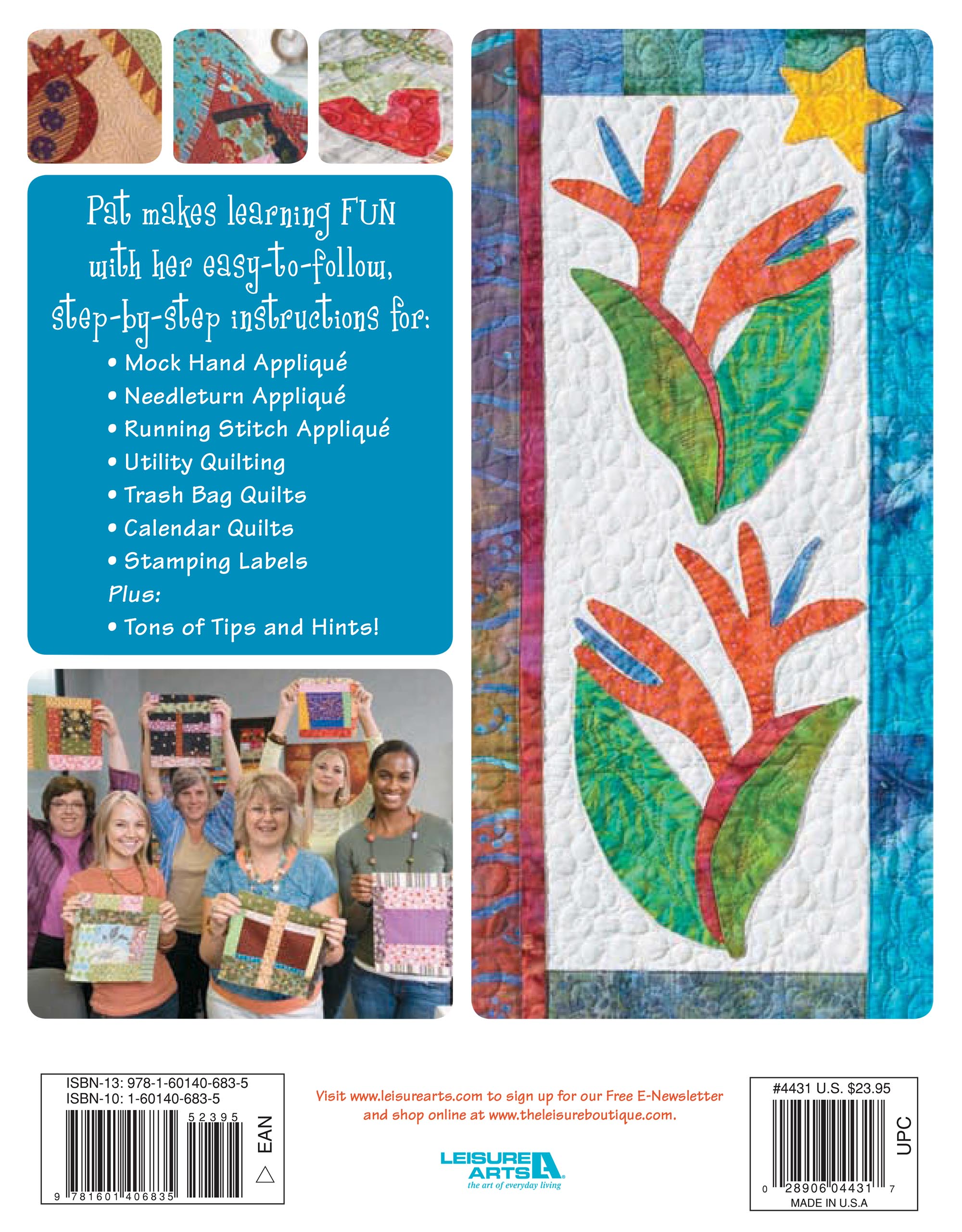 Leisure Arts Pat Sloan's Favorite Techniques eBook- Quilt designer and popular workshop teacher Pat Sloan shares pointers and projects for her favorite techniques: mock hand applique, needleturn applique, running stitch applique, utility quilting, trash bag quilts, calendar quilts and stamping on labels. Includes projects to help you master each technique: own and honey bee mock hand applique quilt, pomegranate crossing needleturn applique quilt, quilters in paradise running stitch applique quilt and many more. Each project includes step-by-step instructions, diagrams and templates. Finished quilt sizes range between approximately 17 1/2"x 42 1/2" and 57"x 73". Easy to intermediate skill level. 114 page PDF download.