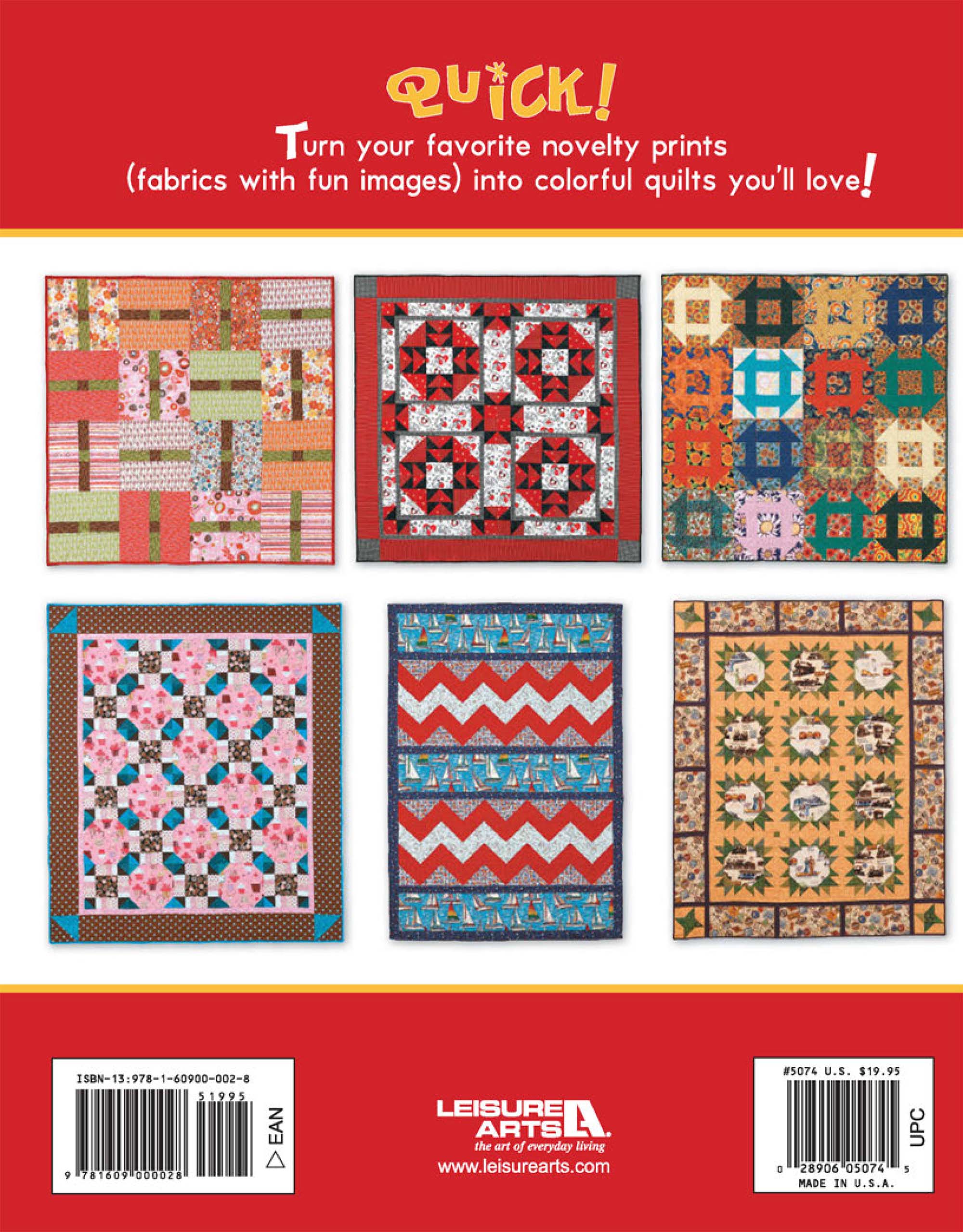 Leisure Arts Pat Sloan's What a Novel Idea eBook- 12 quick quilts, and 4 pillows, that you can make easily from novelty fabrics. Novelty prints all have their own distinctive look and feel that can be a challenge to use in your everyday projects. Designer Pat Sloan offers a guide to using and pairing novelty fabrics to make whimsical quilts from your collection. Projects include: a pair of winners, all aboard, churn dash, cupcakes & confections, doggie adoration and more. Includes two versions of each quilt for a variety of design options, step-by-step instructions for each project and block diagrams. Finished quilt sizes measure approximately 34"x 40" and 63 1/2"x 73". Easy skill level. 82 page PDF download.