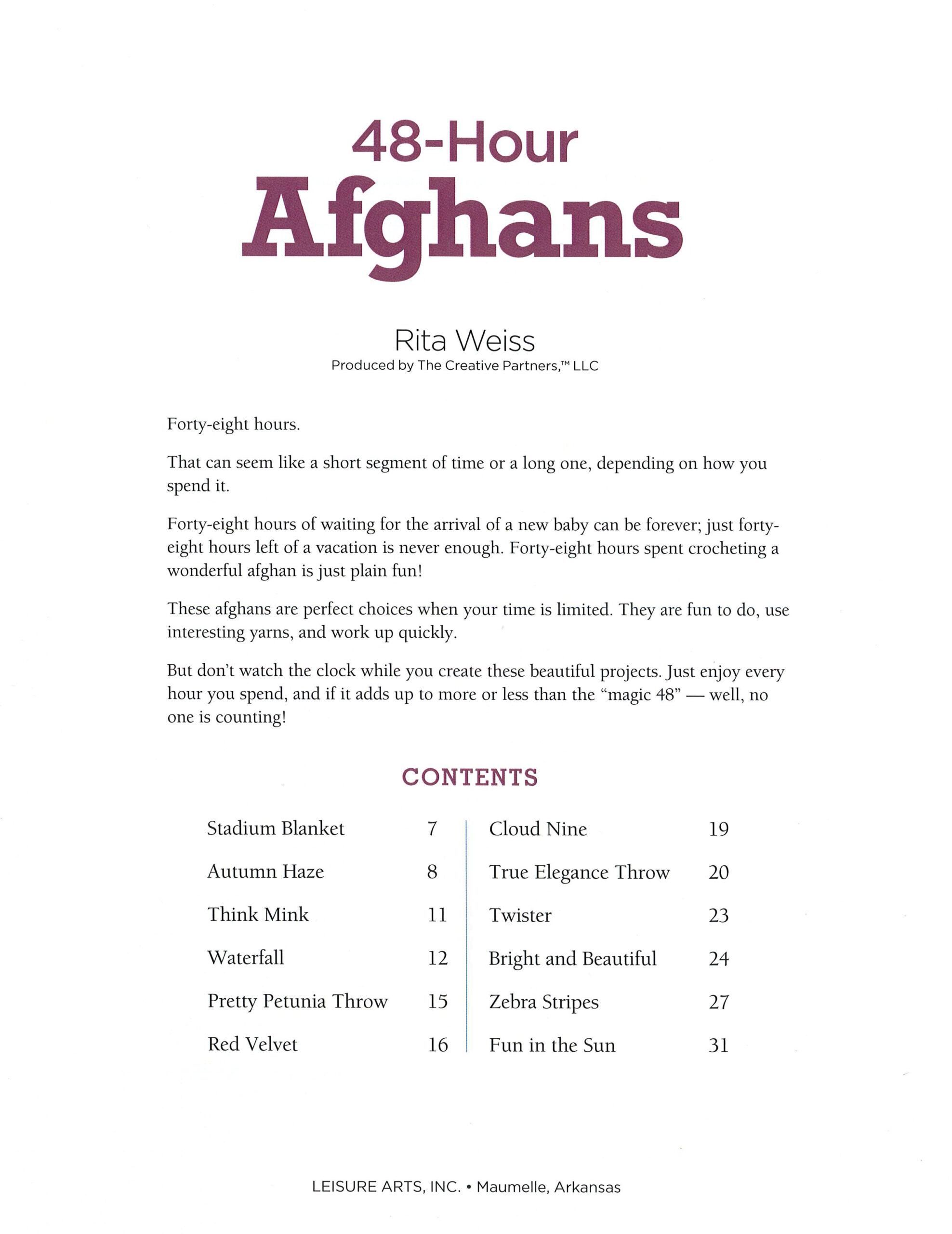 Crochet 48-Hour Afghans- Choose from 12 beautiful throws that work up quickly; each can be completed in only 48 hours. Perfect choices when your time is limited, they are fun to crochet and can be made using interesting and trendy yarns. Projects include stadium blankets, afghans and throws with step-by-step instructions. explains common crochet terms with popcorn, front post treble, back post treble, puff, V, cluster and 3 double crochet cluster special stitches. Patterns call for US size 4 worsted, 5 chunky or 6 bulky weight yarns. Each project uses one hook ranging between US size H-8 and N-13; 5 to 9 millimeter hooks. Finished sizes range between approximately 41″x 52″ and 65″x 67″. 32 pages, soft cover.