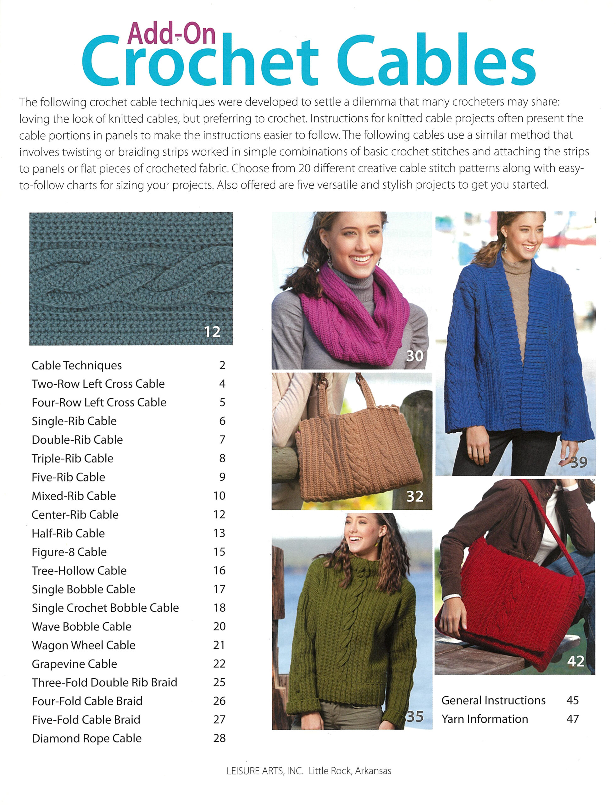 Add On Crochet Cables- If you love the look of cable knits but prefer to crochet, these add-on crochet cables are perfect. Instructions for knitted cable projects often present the cable portions in panels to make the instructions easier to follow. These crochet cables use a similar method that involves twisting or braiding strips worked in simple combinations of basic crochet stitches and then attaching the strips to panels or flat pieces of crocheted fabric. Choose from 20 creative cable styles with charts for sizing and five pretty fashions: a cowl, handbag, messenger bag, funnel neck pullover, and cardigan. 48 pages in a softcover.