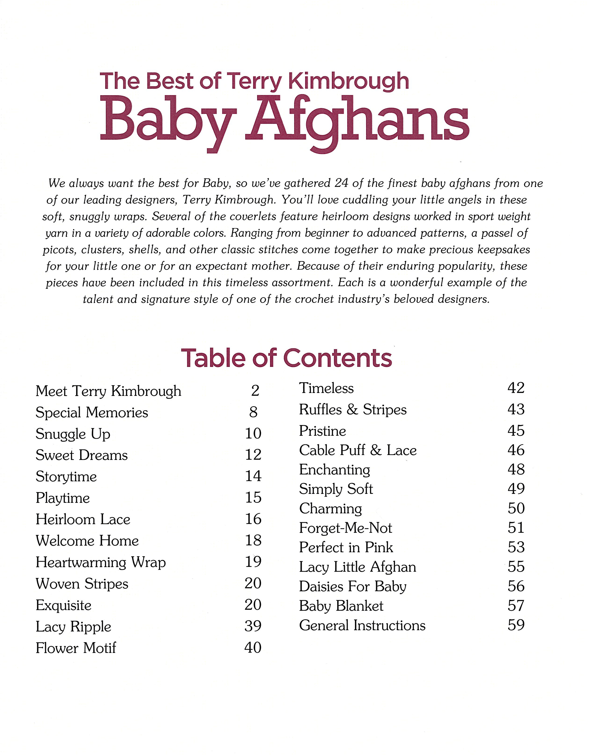 Best of Terry Kimbrough Baby Afghans Crochet- With names like storytime, daisies for baby, and welcome home, you know these sweet wraps are just right for a special infant. Wrap your baby in handcrafted softness with these baby afghan designs. Only the best for Baby. Cuddle your little angel in any of these 24 soft, cuddly wraps. Several coverlets feature heirloom designs. All designs require size 2 sport weight yarn and a hook in US size F-5, G-6 or H-8; 3 3/4, 4, 5 millimeters. Includes basic stitch information and step-by-step instructions. Finished afghan sizes measures between approximately 29″x 40″ and 37″x 46″. Beginner to advanced skill level. 60 pages, soft cover.
