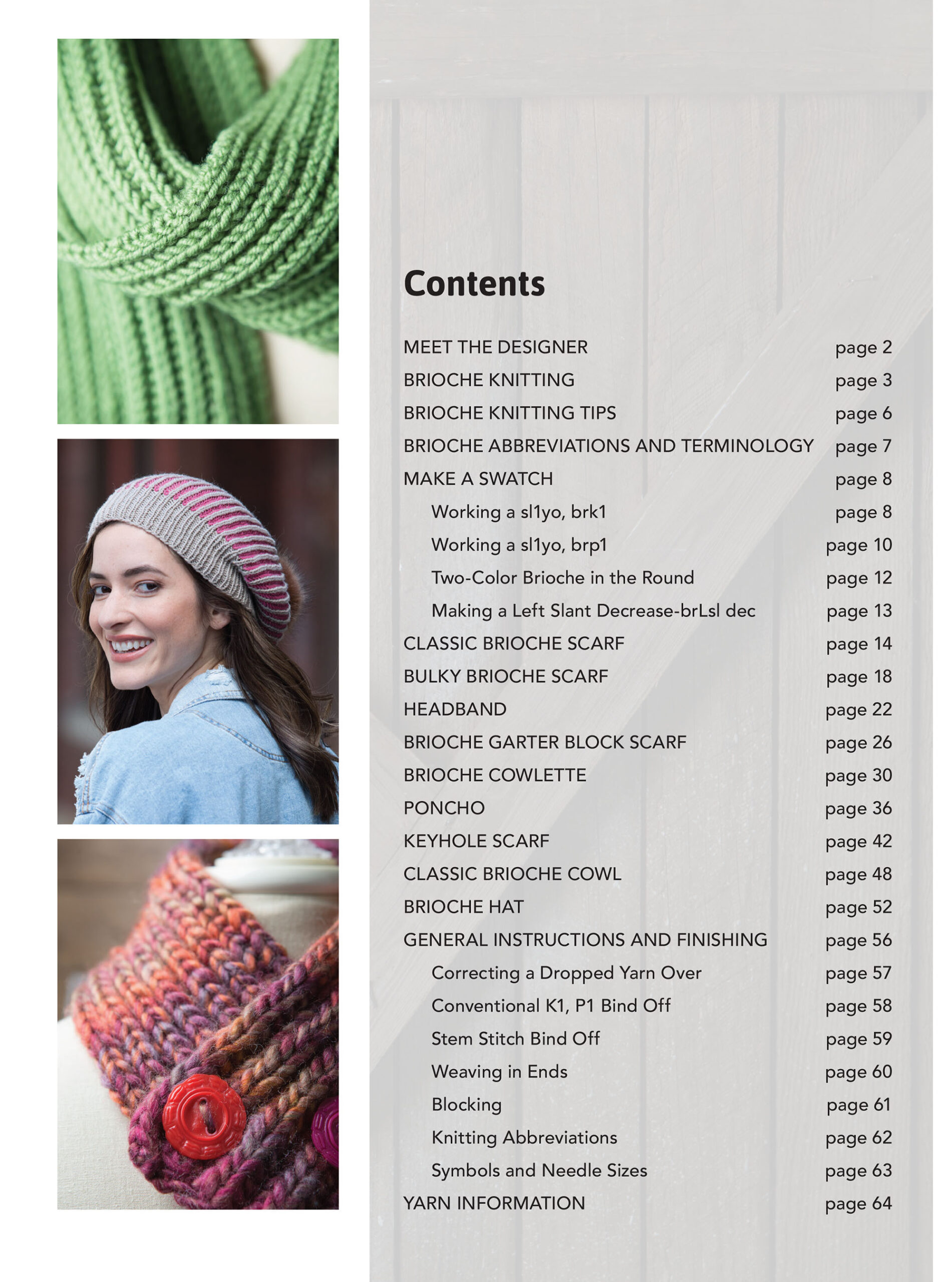 Brioche Knitting- Discover everything you need to know for brioche knitting, which creates a cushy reversible ribbed fabric. Because it is ribbed it lays flat, making it perfect for shawls, scarves, and blankets. These patterns are rated for beginner skill level. Detailed guide on how to create the brioche knit is included with tips, abbreviations, and terminology. Practice with the guided swatch section of the and then plunge into the 9 unique step-by-step designs provided. Includes pictures and supply lists. Choose from: 4 different scarves, a headband, cowlette, poncho, cowl, and hat. 64 pages in a softcover.