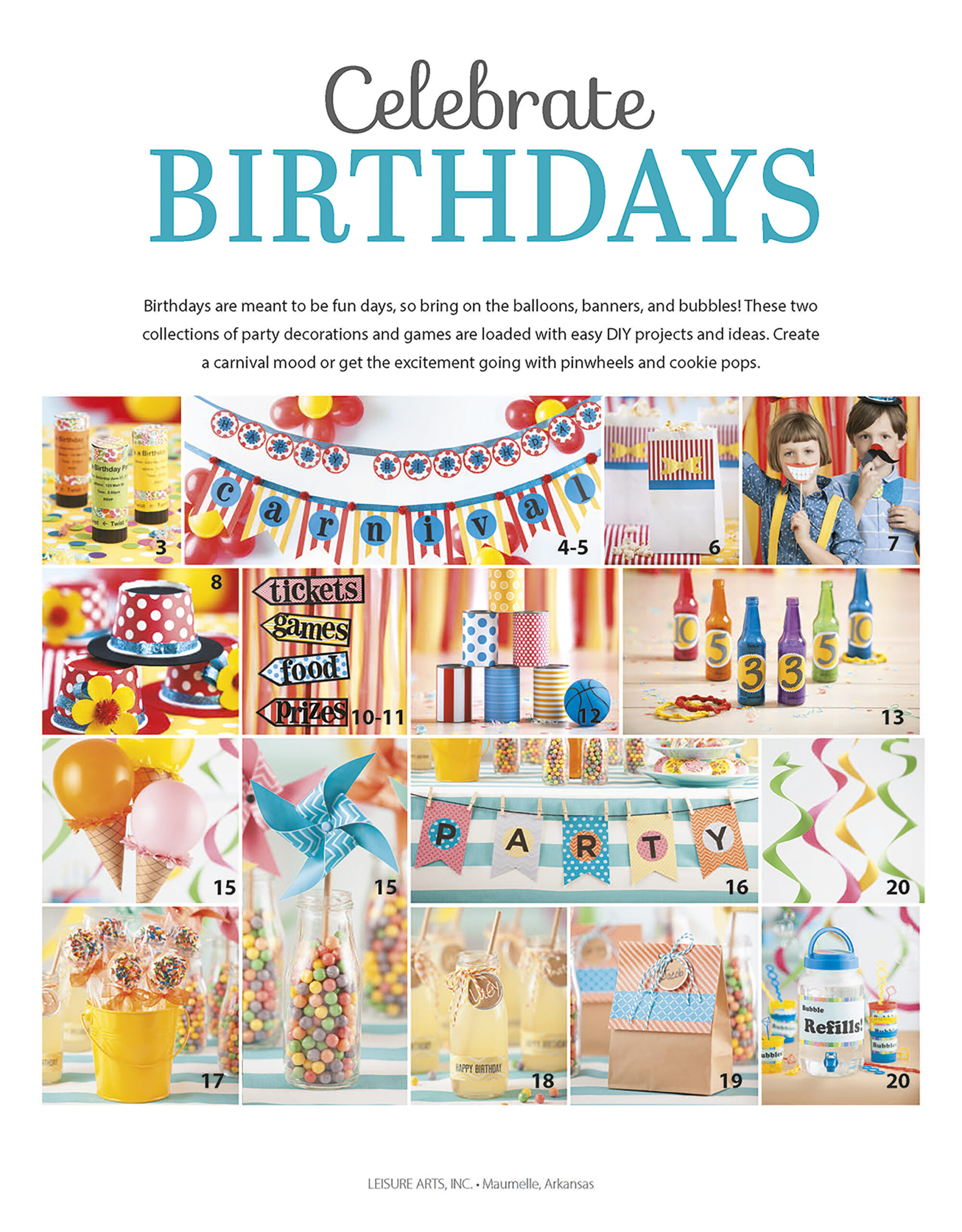 Celebrate Birthdays- For quick and easy celebrations, get the party started with colorful DIY decorations. Themed parties include banners, favors, games, and more. Choose between carnival or sweets and treats party themes. Projects include: banners, invitations, balloon flower, popcorn bags, and more. 24 pages in a softcover.