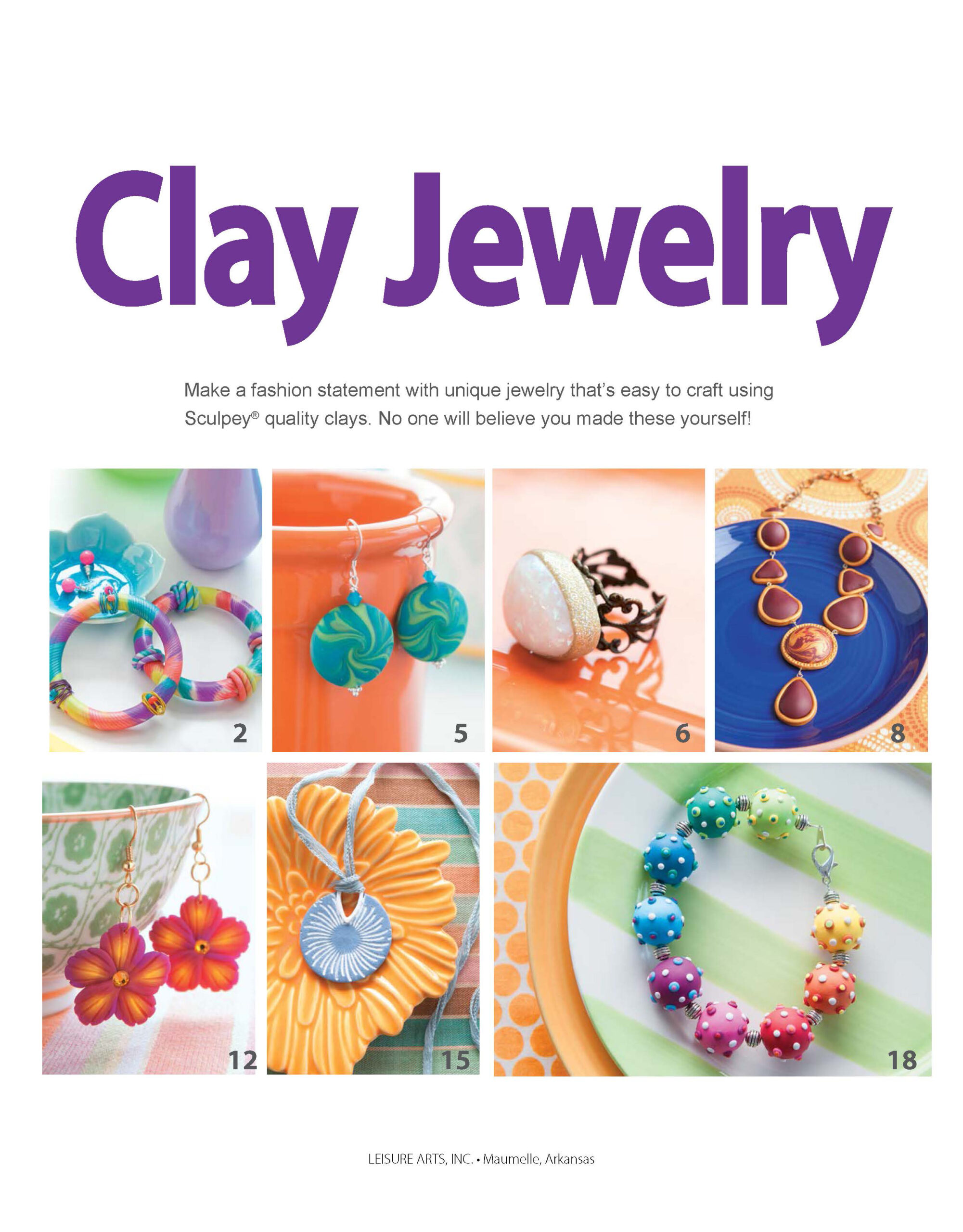Clay Jewelry- Make a fashion statement with unique jewelry that you craft easily with today’s premium polymer clays. Learn how to turn gorgeous colors of oven-bake clay into exquisite jewelry that will capture everyone’s attention. These projects also make for great gifts. Create: bangle bracelet, earrings, ring, necklace, pendant, and beads. Techniques include: color mixing; gradient blending; marbling; adding iridescent, metallic, and glitter accents; working with texturing sheets and tools; antiquing; and more. Designs can easily be adjusted to fit anyone. Follow baking instructions on polymer clay packaging. 24 pages, softcover.