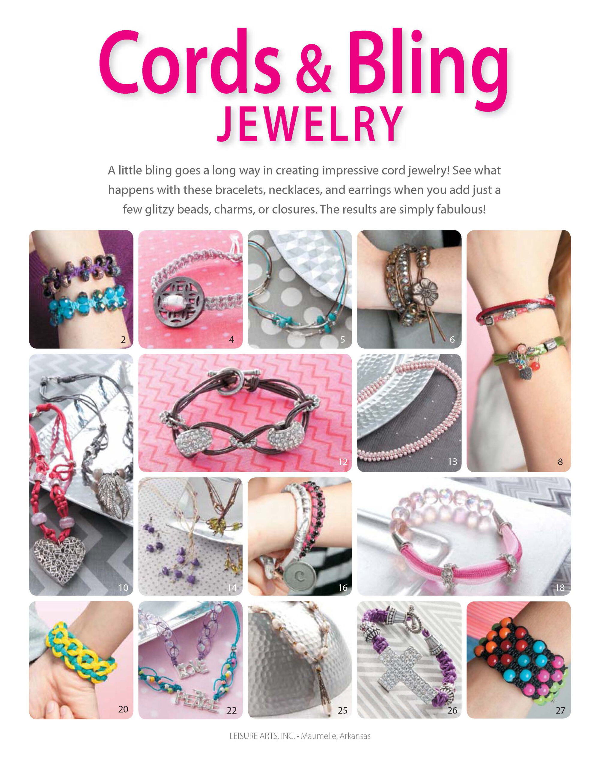 Cords & Bling Jewelry- Accent your cord creations with sparkle & shine. A little bling can go a long way in creating impressive cord jewelry. See what happens with these simple bracelets, necklaces, and earrings when you add just a few glitzy beads, charms, or closures. The results are simply fabulous. Designs include: zigzag bracelet, ladder bracelet, button bracelet, tube bead bracelet and necklace, triple-wrap bracelet, bangle bracelet, heart necklace and many more. Projects call for cording, basic findings, charms and beads. Finished designs can be easily adjusted to fit anyone. Easy skill level. 32 pages, softcover.