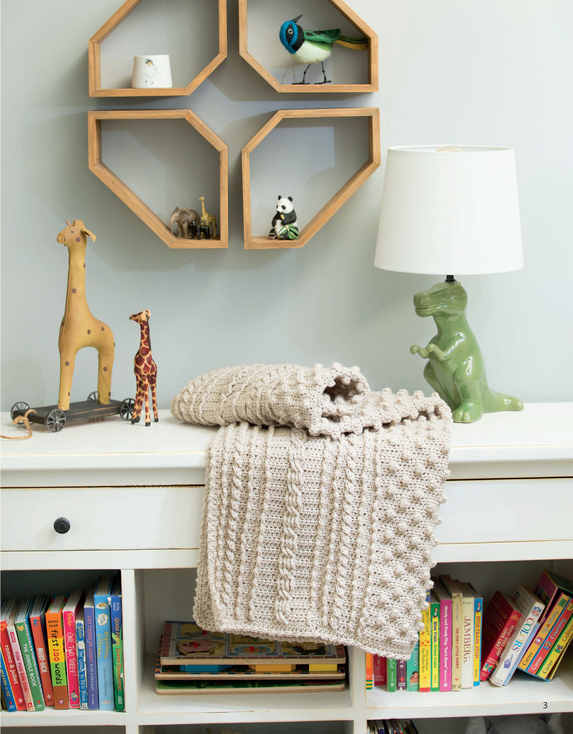 Crochet Baby Blankets Crochet- Crochet 8 adorable blankets. Designs that both parents and baby will adore with plenty of texture for exploring fingers. Each is crocheted using easy or easy plus skill level techniques like: color changing, front post, back post, popcorn, picot and Tunisian crochet. Yarn weights include size 2 fine, 3 light and 4 medium. Work with US hook sizes G, H or I. Thermal is made with US H afghan hook. Blankets range in size from 25.5”x 32” to 38.5”x 52.5”. 32 pages, softcover.