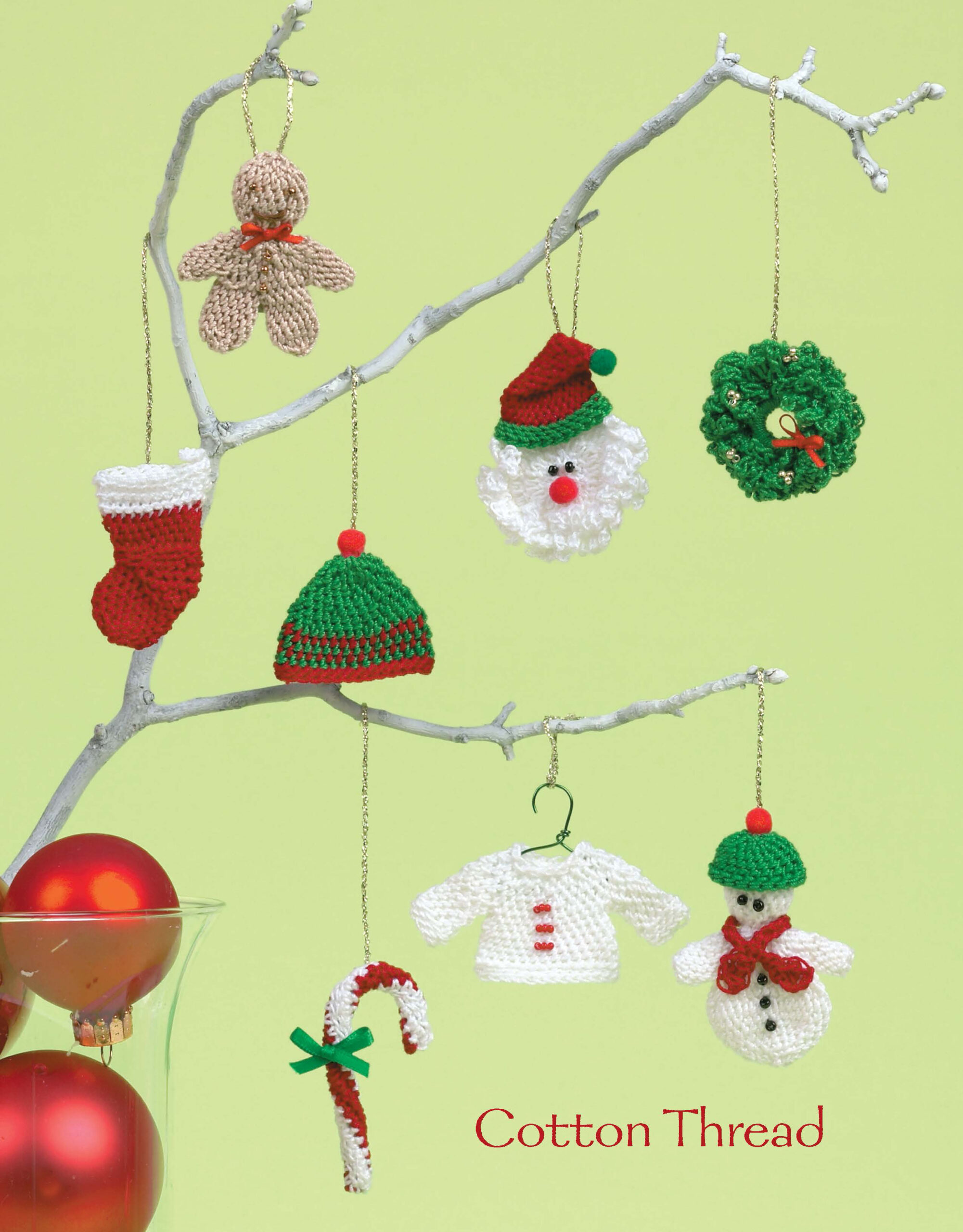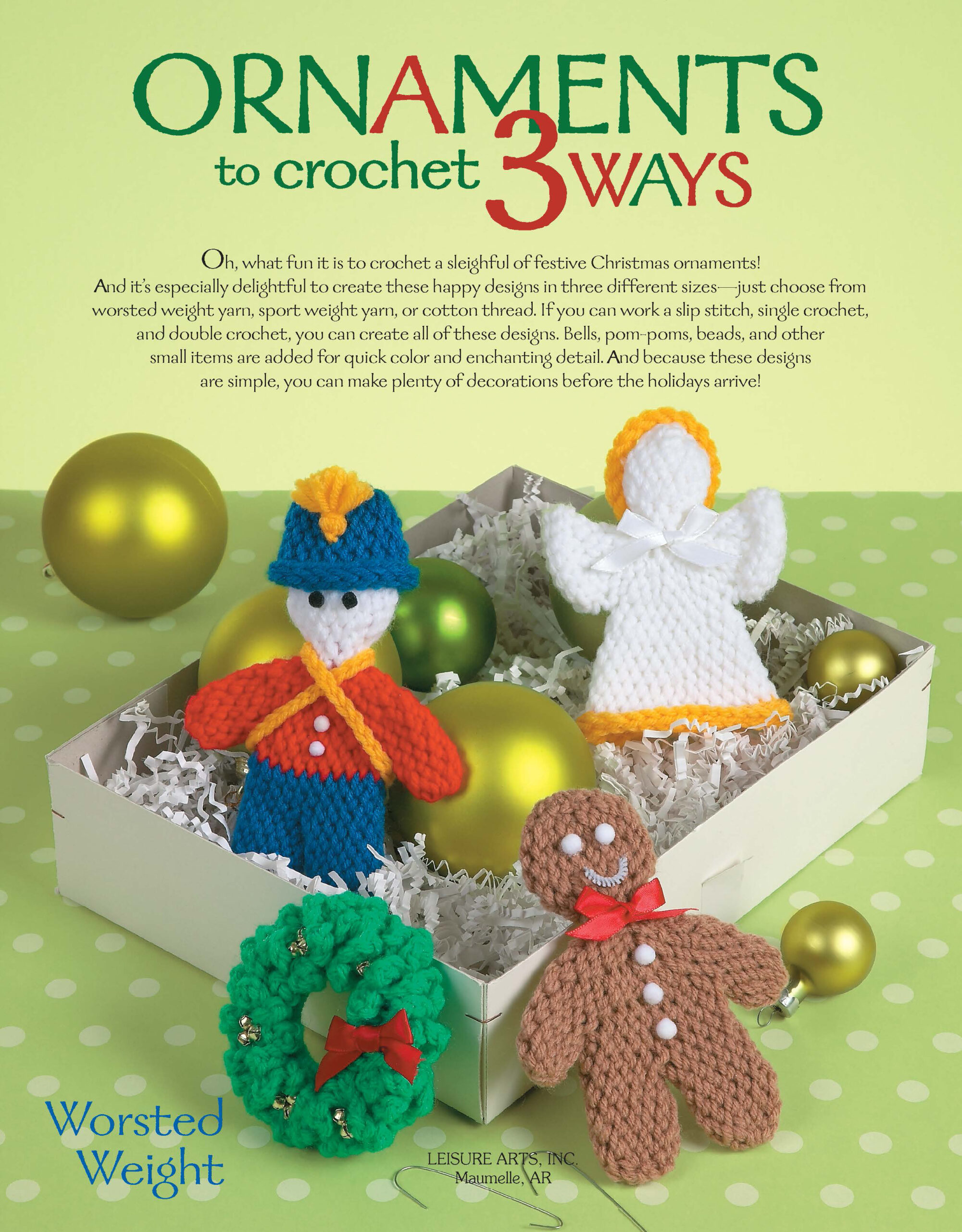 Ornaments To Crochet 3 Ways- Crochet a sleighful of festive Christmas ornaments in three different sizes; just choose from worsted weight yarn, sport weight yarn, or cotton thread. If you can work a slip stitch, single crochet, and double crochet, you can create all of these designs. Bells, pom-poms, beads, and other small items are added for quick color and enchanting detail. Motifs include: gingerbread man, Santa Claus, angel, wreath, ski hat, stocking, sweater, ice skate, candy cane, snowman, bell, and toy soldier. Projects call for crochet hooks in US sizes H-8, F-5 and steel 1. Finished ornaments measure between approximately 1 1/2″ and 3″. Beginner skill level. 32 pages, softcover.