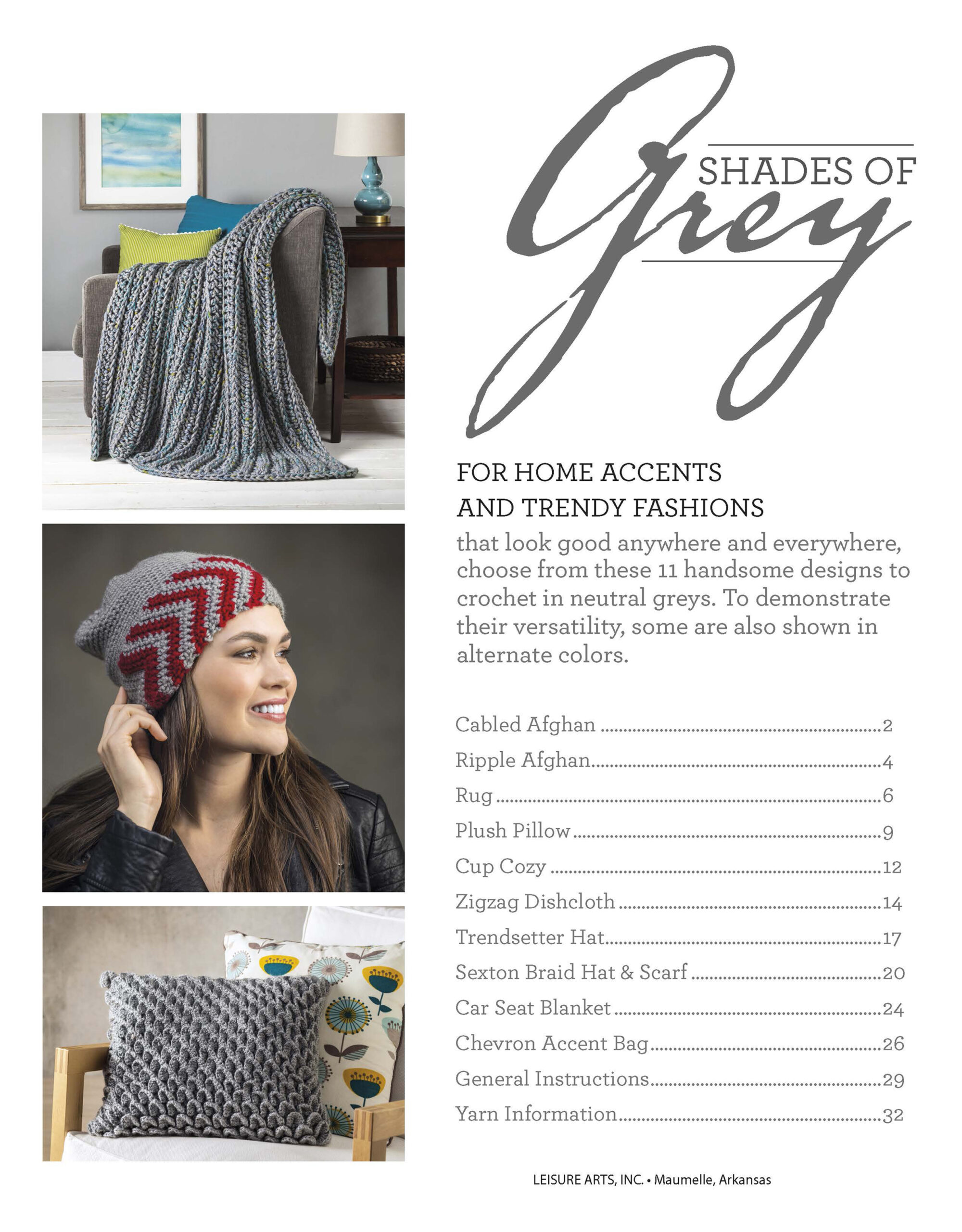 Shades of Grey Crochet- Accessorize your home and wardrobe with beautiful crochet designs in calming shades of grey. Faux cables, crocodile stitch, and other textures add richness that will keep you warm and cozy all-year-round. Designs include: cabled afghan, ripple afghan, plush pillow, zigzag dishcloth, and more. Easy skill level designs are quick to finish. 32 pages, soft cover.