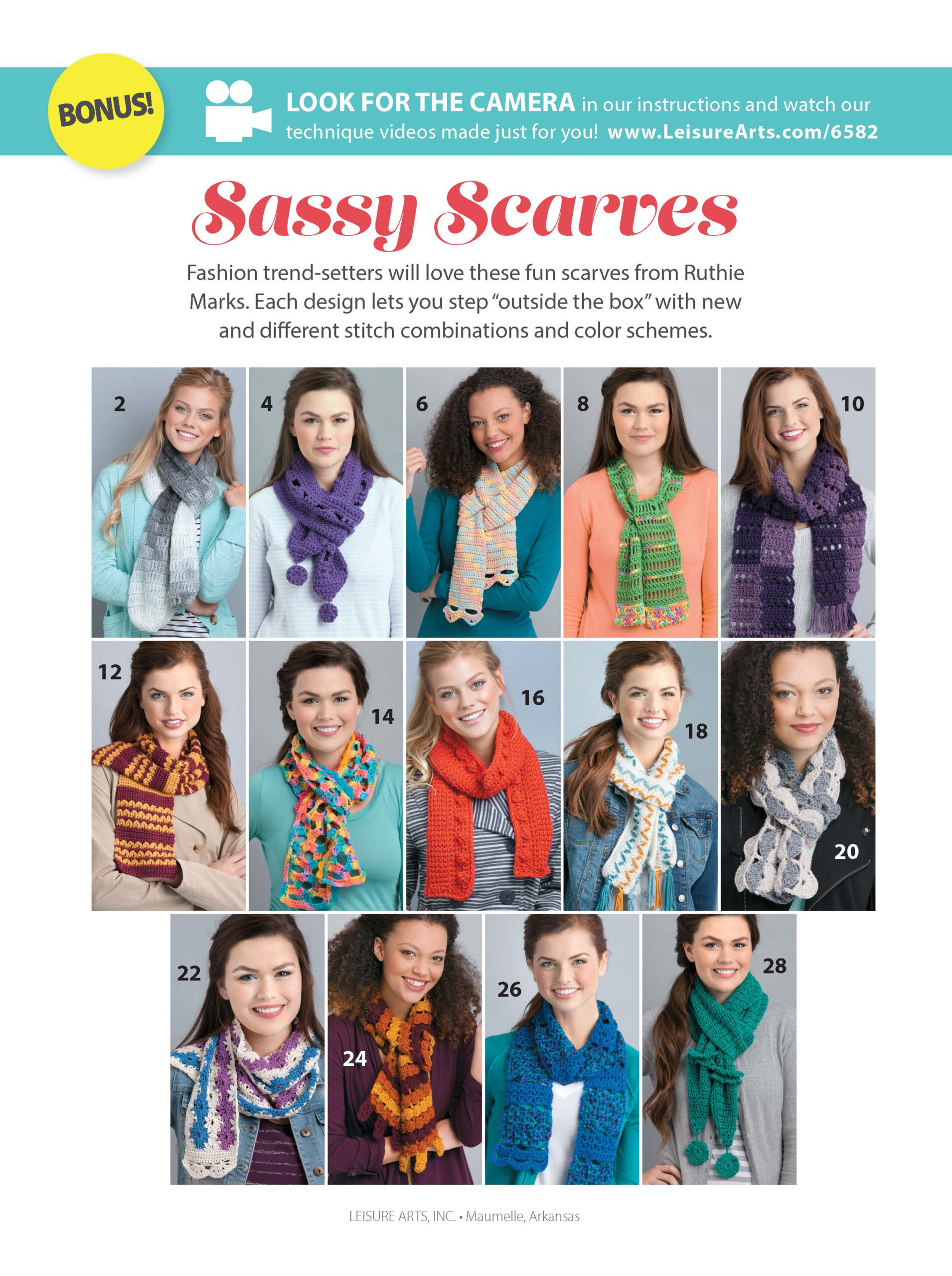 Sassy Scarvess- Deliver special style and attitude with fresh colors and stitch patterns. Crochet one for every mood, and make plenty for gifts, too! 14 designs mean limitless options. Designs include: celebration, rainbows, checkmate, zesty, mirror image, and more. 32 pages, soft cover.