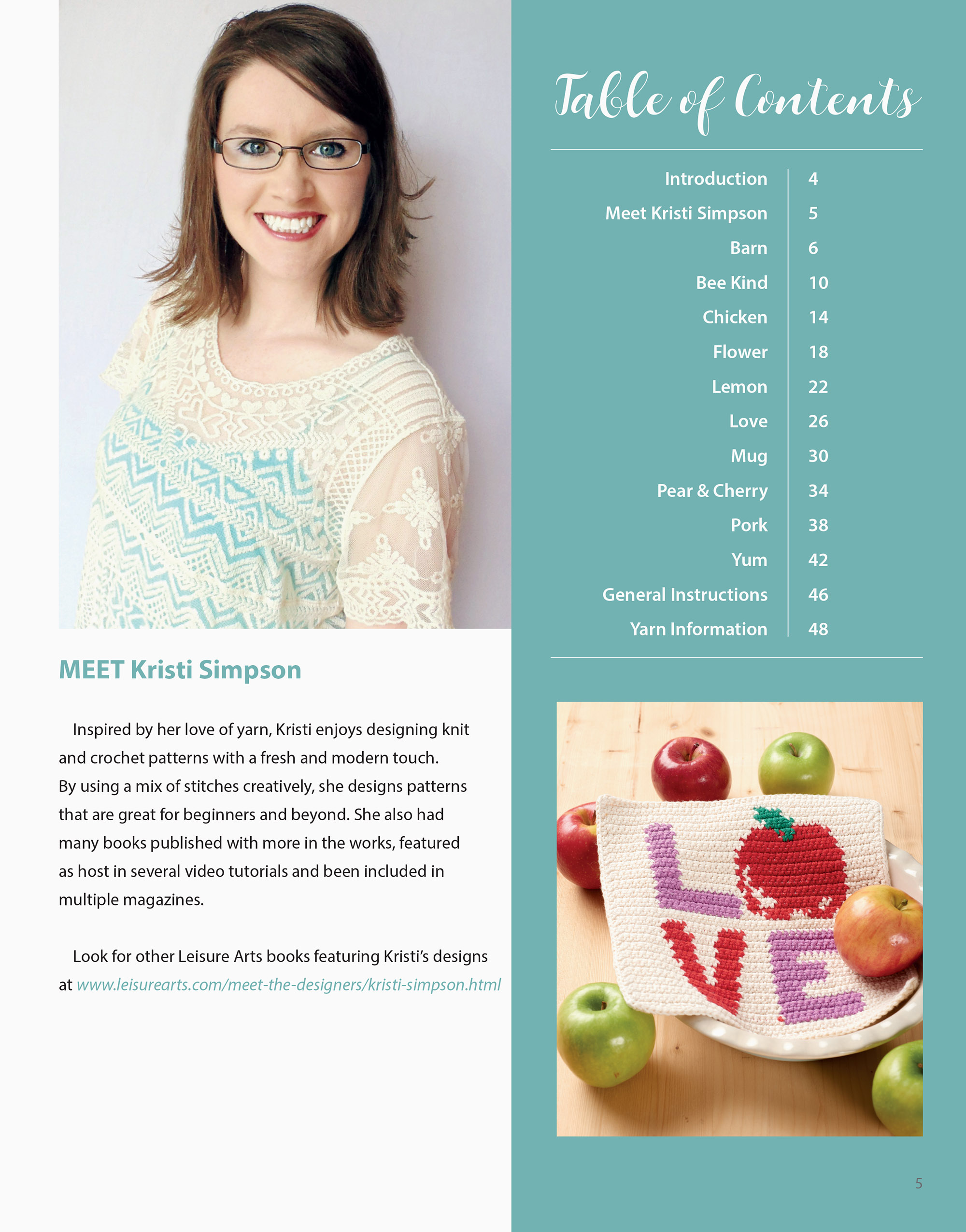 Yummy Crochet- Who doesn’t love a beautiful project with a yummy meal to complement it? This walks you through how to replicate 10 dishcloth designs and 10 accompanying themed recipes. Crochet yourself and your family some tasty memories. Projects designs include bees, fruit, barns, chickens, pigs and more. Recipes include: beefy gumbo, honey mustard, cheesy chicken pasta, sparkling lemonade and more. Comes with step-by-step instructions, diagrams and color charts to make each project a breeze. Requires: US size 4 medium weight yarn and a size G-6, 4 millimeter, hook. Beginner skill level. Finished towel sizes measure approximately 10 1/2″x 10 1/2″. 48 pages, soft cover.
